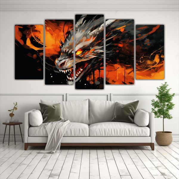 Este cuadro de abstracción dragón en naranja y negro es ideal para colocar en la sala de estar sobre un sofá gris para resaltar los tonos de la obra Complementa con cojines en azul marino y plateado para crear un ambiente moderno y elegante