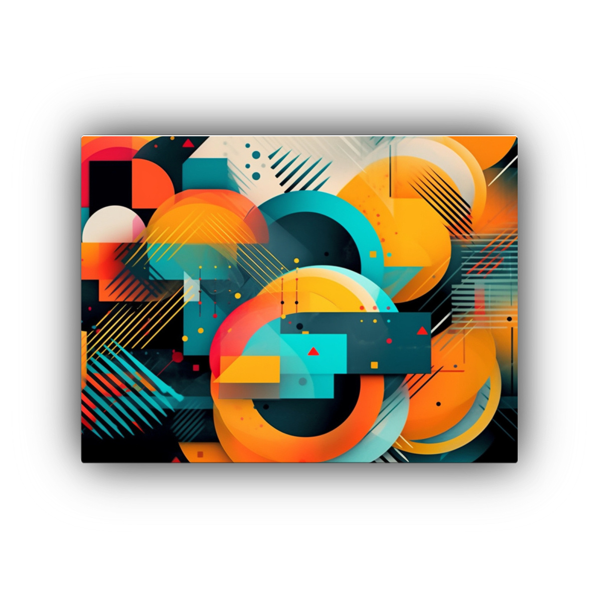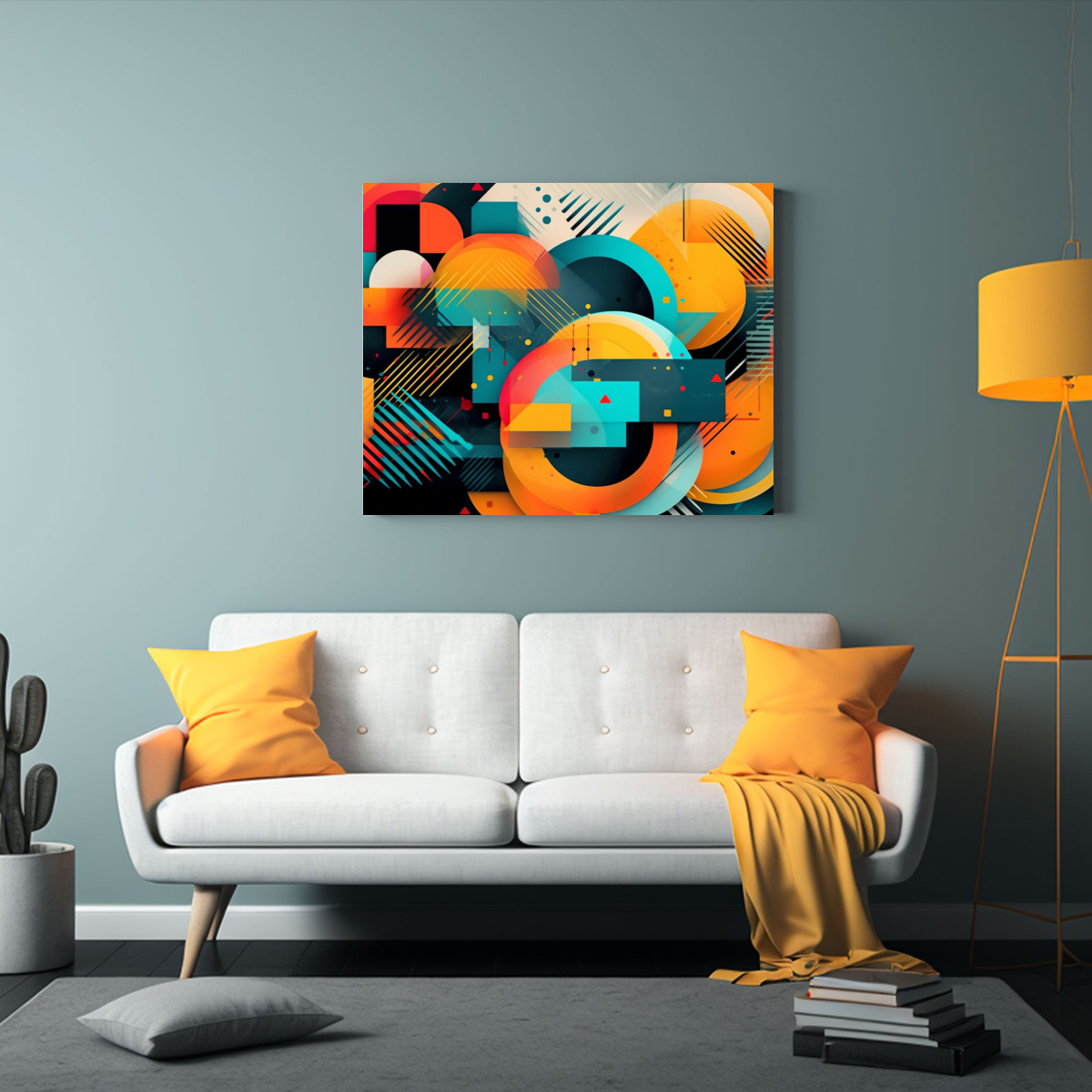 Este cuadro de abstracción colorida y geométrica sería ideal para decorar un espacio moderno como la sala de estar o el estudio Combínalo con muebles de colores neutros para resaltar su vibrante presencia y añadir un toque de sofisticación a la habitación