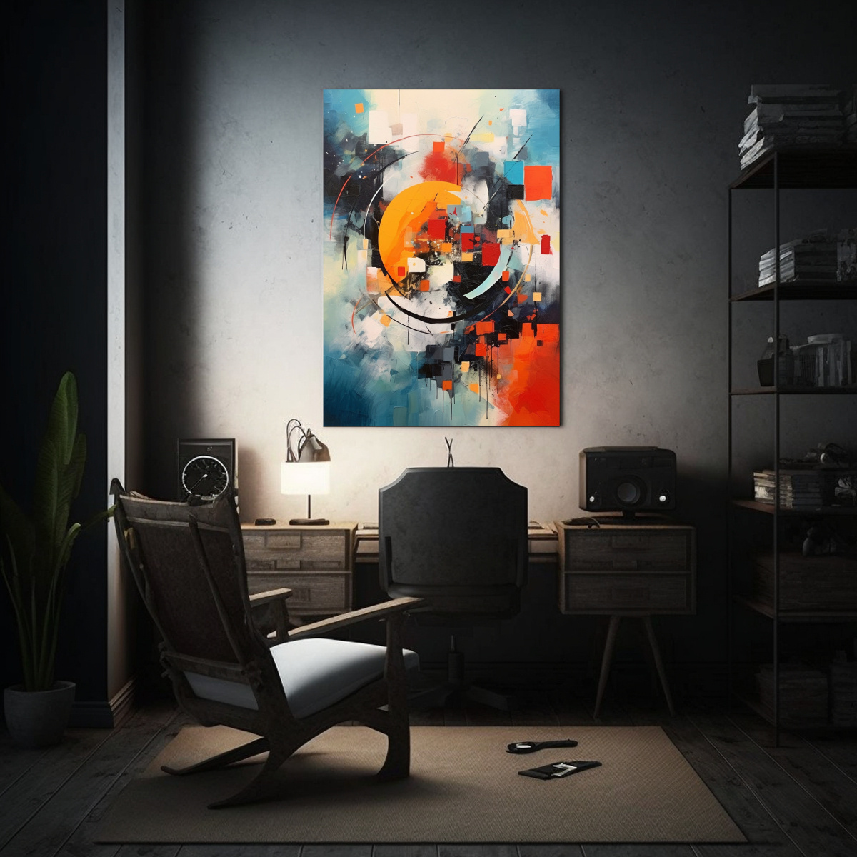 Coloca este cuadro en la sala de estar para crear un ambiente acogedor y moderno Combínalo con muebles en tonos neutros como gris y blanco, y agrega cojines en colores como coral y turquesa para resaltar la calidez y originalidad de la pintura También puedes colocarlo en un dormitorio para darle vida a la decoración y hacerlo más vibrante