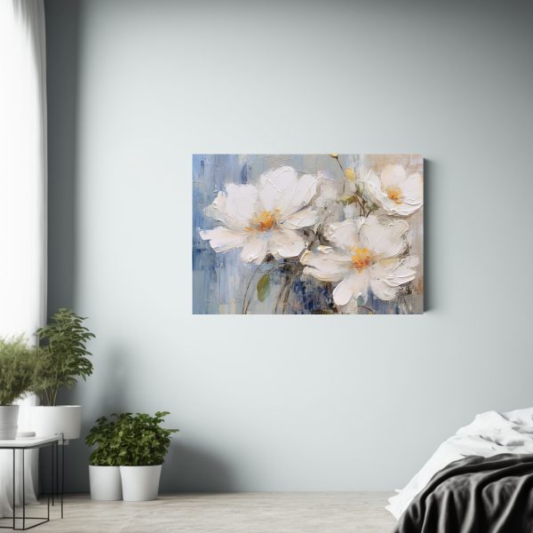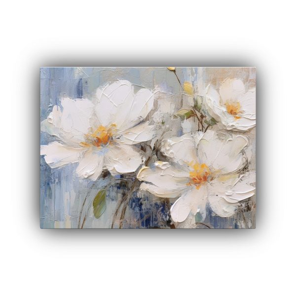 Este cuadro abstracto con flores blancas en tonos plateados, azules y grises es perfecto para decorar tu sala de estar o dormitorio, creando un ambiente moderno y chic Combínalo con muebles en tonos neutros para resaltar su belleza y elegancia