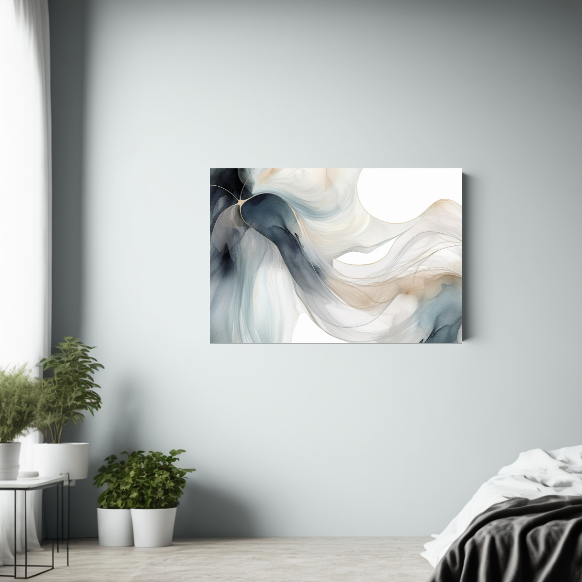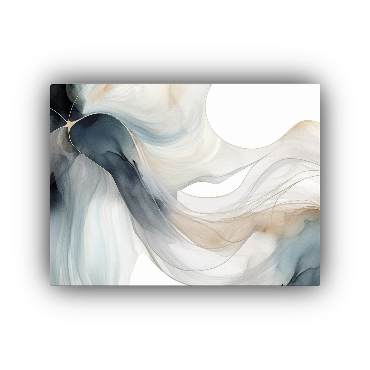 Este cuadro abstracto con texturas acuarela en tonos azul marino grisaceo, beige, gris y plateado sería perfecto para decorar el salón principal de tu hogar Colócalo sobre un sofá en tonos neutros para crear un contraste elegante y sofisticado Complementa la decoración con cojines en los mismos tonos para lograr un ambiente armonioso y moderno ¡Impresiona a tus invitados con esta pieza única de arte gráfico!