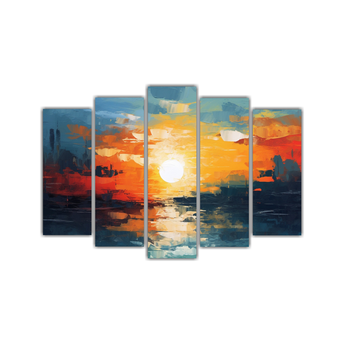 Decora tus espacios con el Set 5 Cuadros Fine Lines Calidez Abstract, que representa un atardecer con trazos de pincel en tonos cálidos y relajantes Añade un toque de elegancia y calidez a tu sala, dormitorio o sala de estar