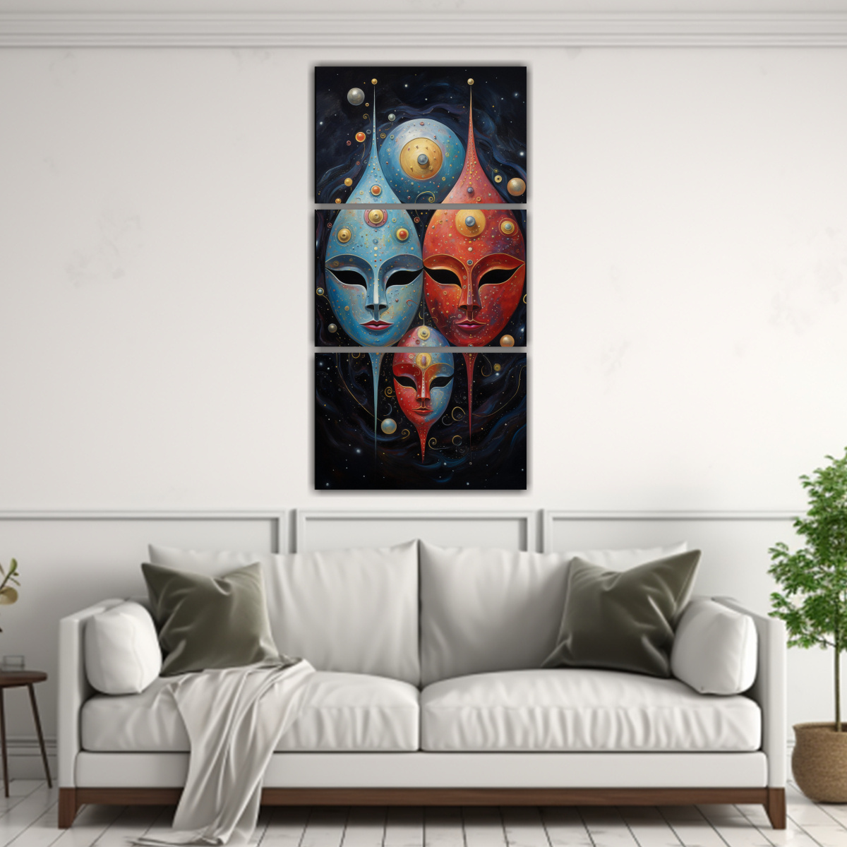 Este cuadro abstracto celestial masquerade con tonos originales sería ideal para decorar tu sala de estar sobre un sofá de color neutro, creando un contraste elegante y sofisticado Asegúrate de contar con una iluminación adecuada para resaltar los colores y detalles de la pintura