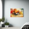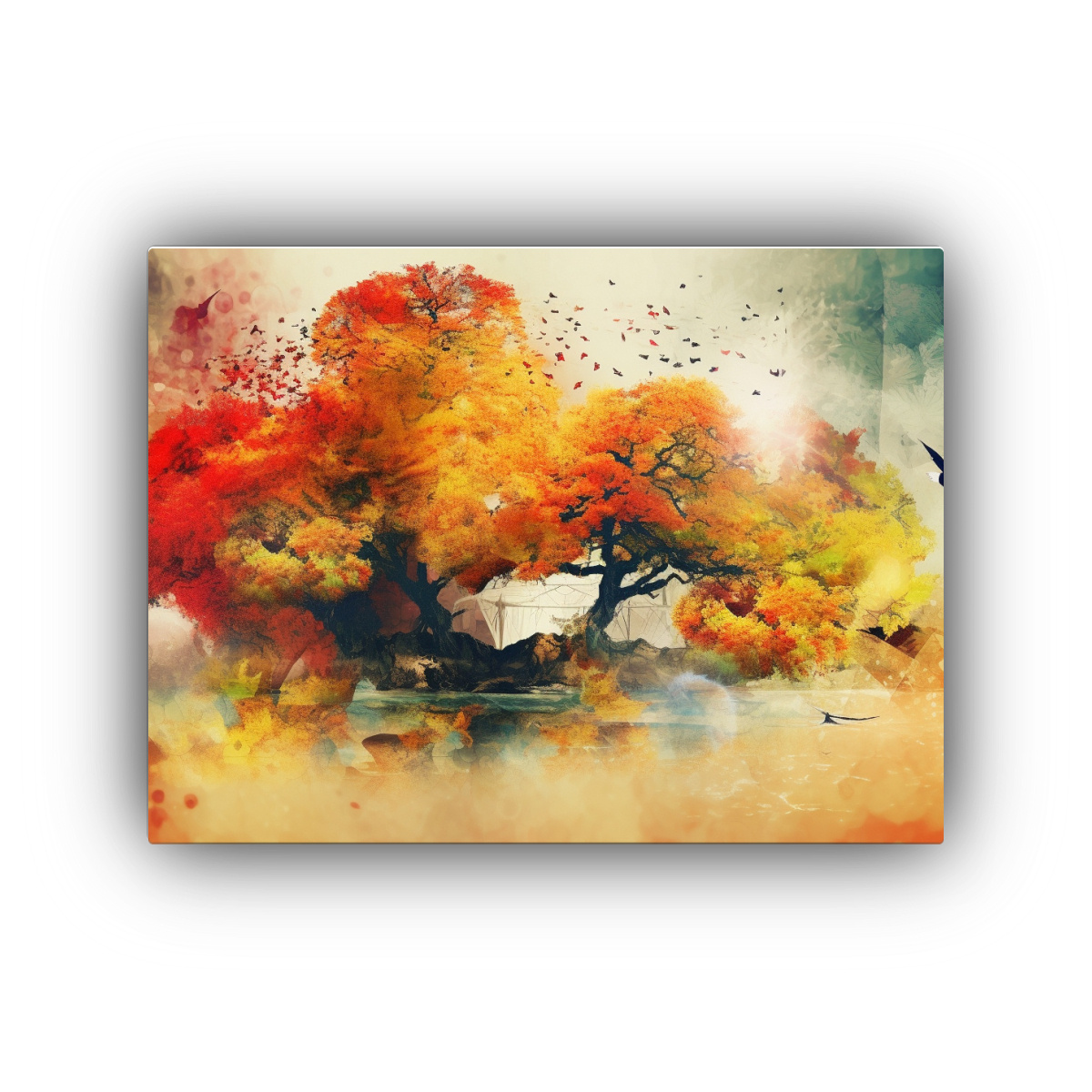 Para resaltar la belleza de este cuadro abstracto de otoño, te recomiendo colocarlo en una pared de tono blanco o beige claro, permitiendo que los colores como el Coral y el Azul Marino grisaceo brillen y se conviertan en el punto focal de la habitación Acompáñalo con cojines en tonos Mostaza para lograr una armonía cromática