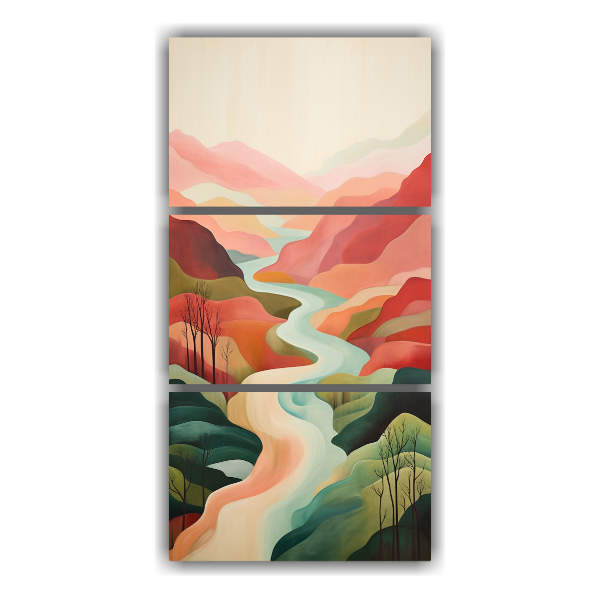 Descubre nuestras tres composiciones modernas en forma abstracta que capturan la esencia del paisaje del río Hudson Renueva tu espacio con cuadros impresos en tela de alta calidad y bastidores de madera Resalta tu decoración con colores vibrantes y relajantes ¡Hazte con uno hoy!
