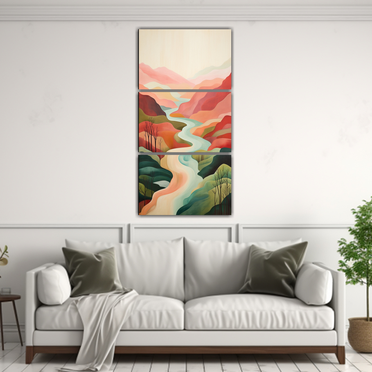 Este cuadro abstracto de paisaje moderno al estilo del río Hudson sería perfecto para colocar en la sala de estar sobre un sofá gris claro, creando un punto focal elegante y sofisticado Combina con cojines en tonos coral y gris para una decoración armoniosa y moderna