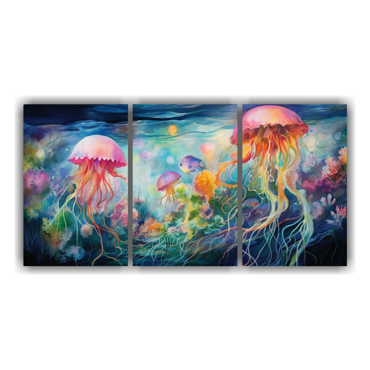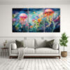 DecoCuadros te ofrece composiciones abstractas de gran belleza, capturando la magia de una escena submarina en tonos suaves Los colores como el menta, verde azulado, negro, coral y carmesí, se combinan para crear una experiencia visual única y relajante Nuestros cuadros decorativos son ideales para aquellos que buscan un diseño exclusivo y de calidad