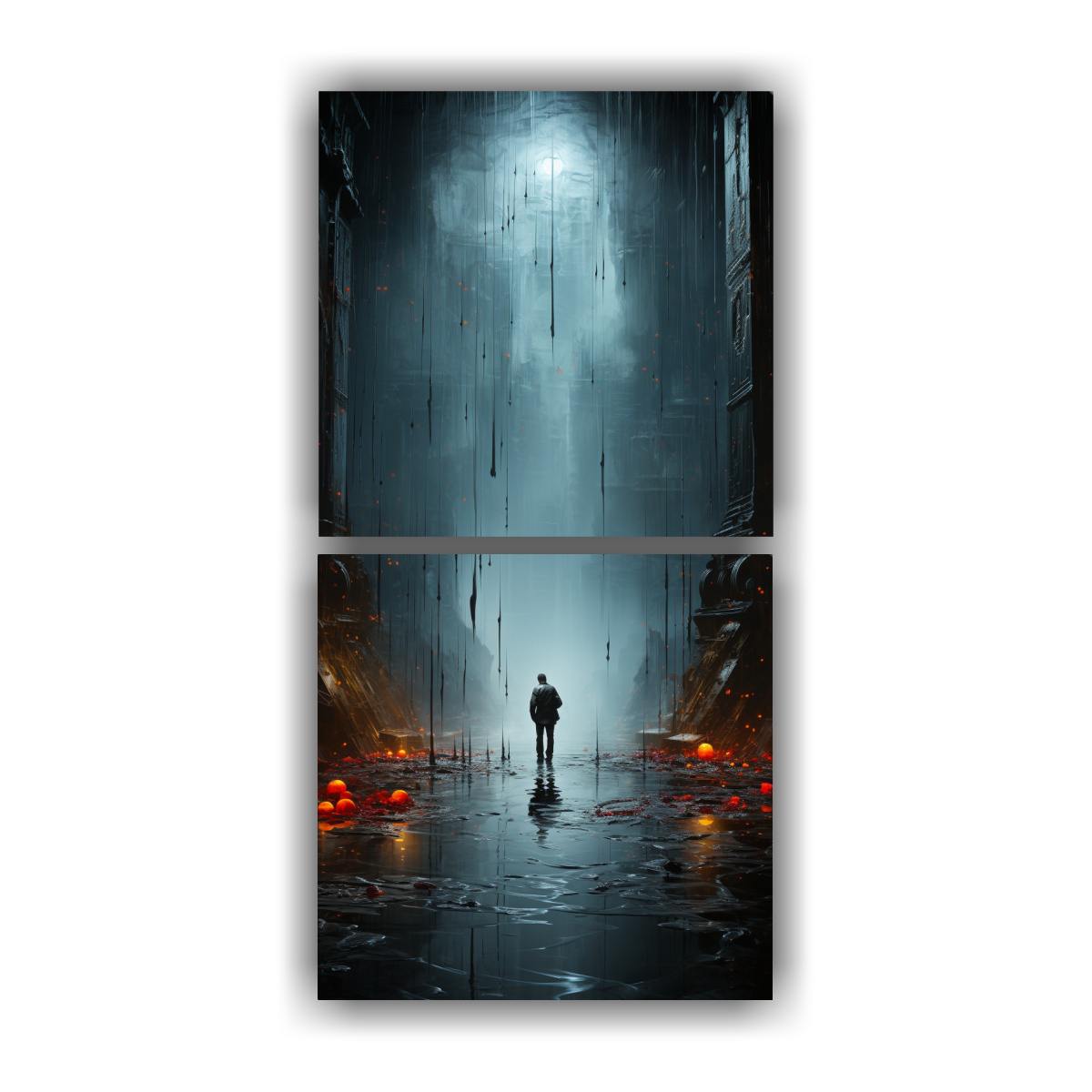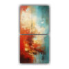 Descubre nuestras pinturas abstractas en perspectiva cinematográfica con concepto de dos telas en bastidor Colores turquesa, azul marino grisaceo, gris, plateado, dorado, carmesí y chocolate