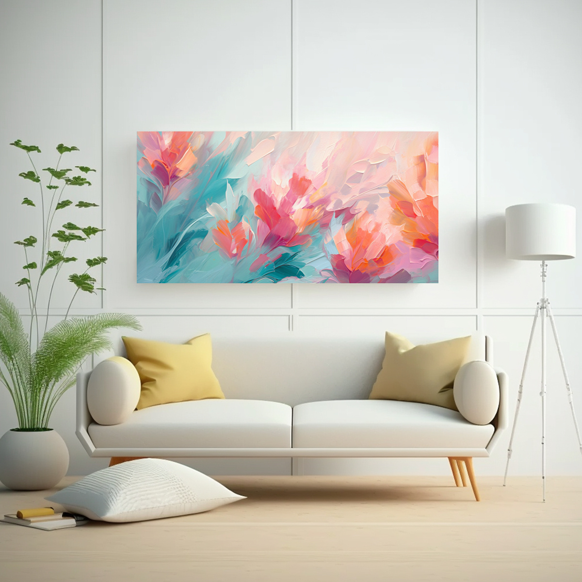 Este cuadro sería ideal para colocar en un ambiente moderno y minimalista, en una sala de estar junto a muebles blancos y detalles en tonos pastel También puede destacar en un dormitorio combinado con elementos decorativos en plata y turquesa para crear un ambiente relajante y elegante