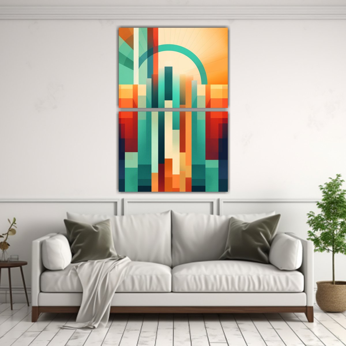 Este set de 2 composiciones geométricas brillantes sería perfecto para decorar tu sala de estar Puedes colgarlos en la pared principal sobre el sofá o colocarlos en estanterías flotantes para agregar un toque moderno y sofisticado a tu espacio Combínalos con muebles en tonos neutros y complementa la decoración con cojines en los colores presentes en los cuadros ¡Crearás un ambiente armonioso y lleno de estilo!