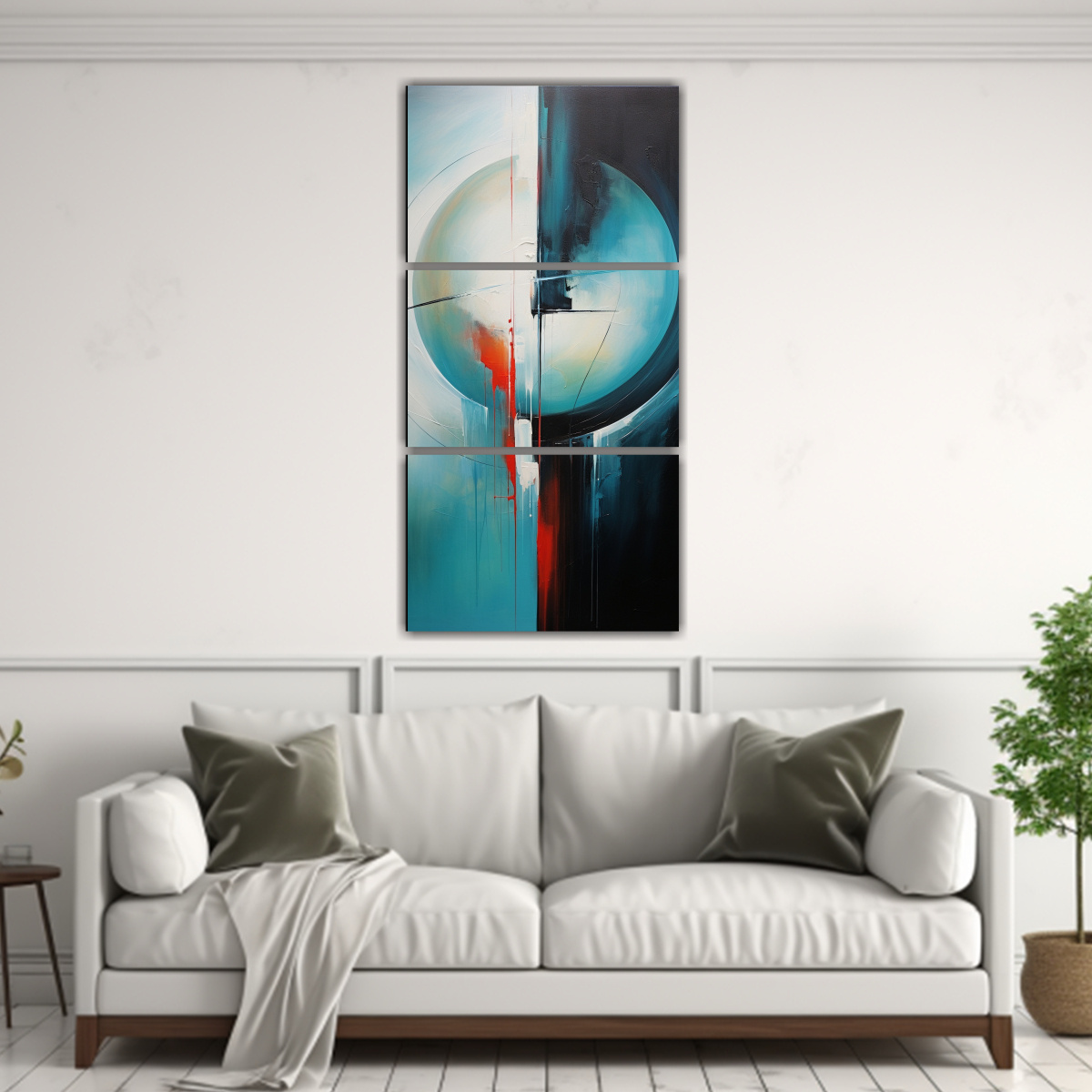 Coloca este set de cuadros abstractos en la sala de estar para crear un punto focal único Combina los tonos plateado, azul marino grisaceo, menta, turquesa, verde azulado, carmesí y coral con muebles en colores neutros para lograr un ambiente moderno y sofisticado