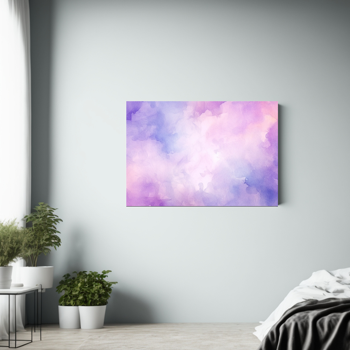 Este cuadro se vería espectacular colocado en la sala de estar sobre un mueble blanco, resaltando la belleza de los tonos lila y rosado claro Complementa con cojines en tonos neutros para lograr un ambiente armonioso y elegante