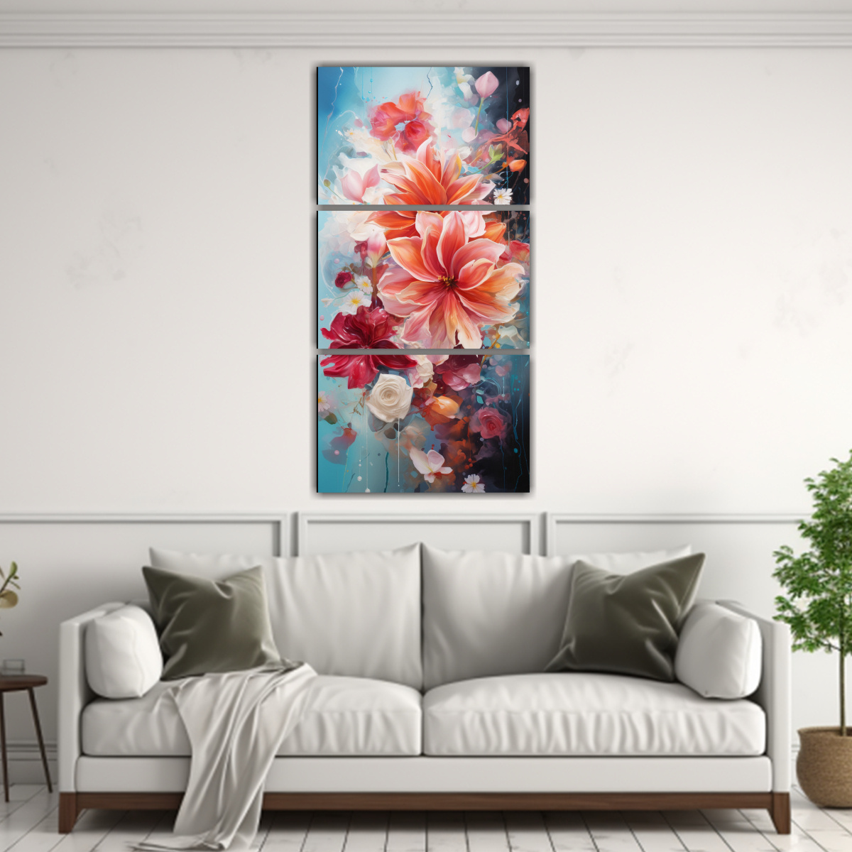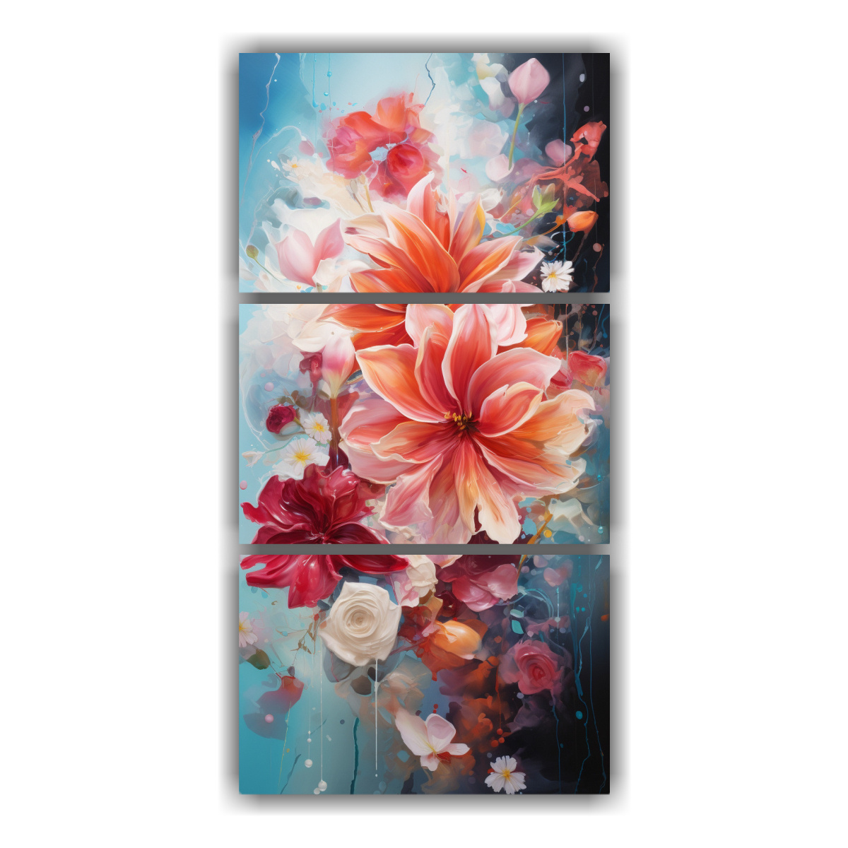 Este cuadro Tríptico Vertical Creatividad Blooming flowers in abstract perspectives es ideal para decorar tu sala de estar o tu dormitorio Su combinación de colores plateado, carmesí, azul marino grisáceo, gris, coral, lila, menta y turquesa aportará un toque de elegancia y modernidad a tu espacio Colócalo sobre un mueble blanco o en una pared de tonos neutros para resaltar su belleza