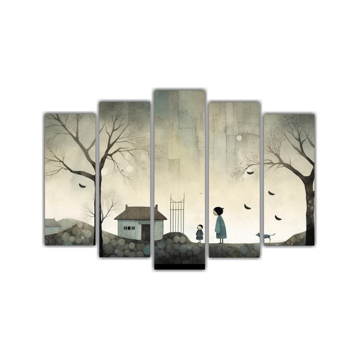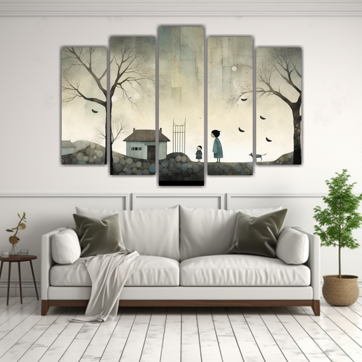 Para lograr un ambiente acogedor y elegante, te recomendamos colocar este set de cuadros en la sala de estar sobre un sofá beige, creando un contraste armonioso con las paredes grises Añade cojines en tonos plateados y azul marino para completar la decoración y lograr un espacio único y sofisticado