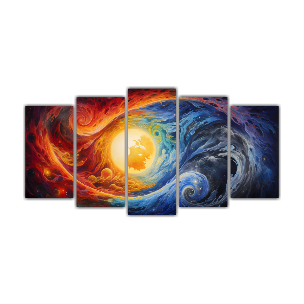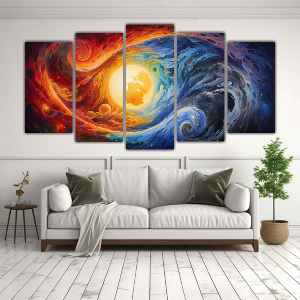 Este cuadro Cinco Lienzos Yin Yang en Estilo oleo por Caroli es ideal para decorar tu sala de meditación o tu espacio de trabajo Colócalo en una pared blanca para resaltar la intensidad de sus colores y crear un ambiente de equilibrio y serenidad ¡Atrévete a fusionar arte y armonía en tu hogar!