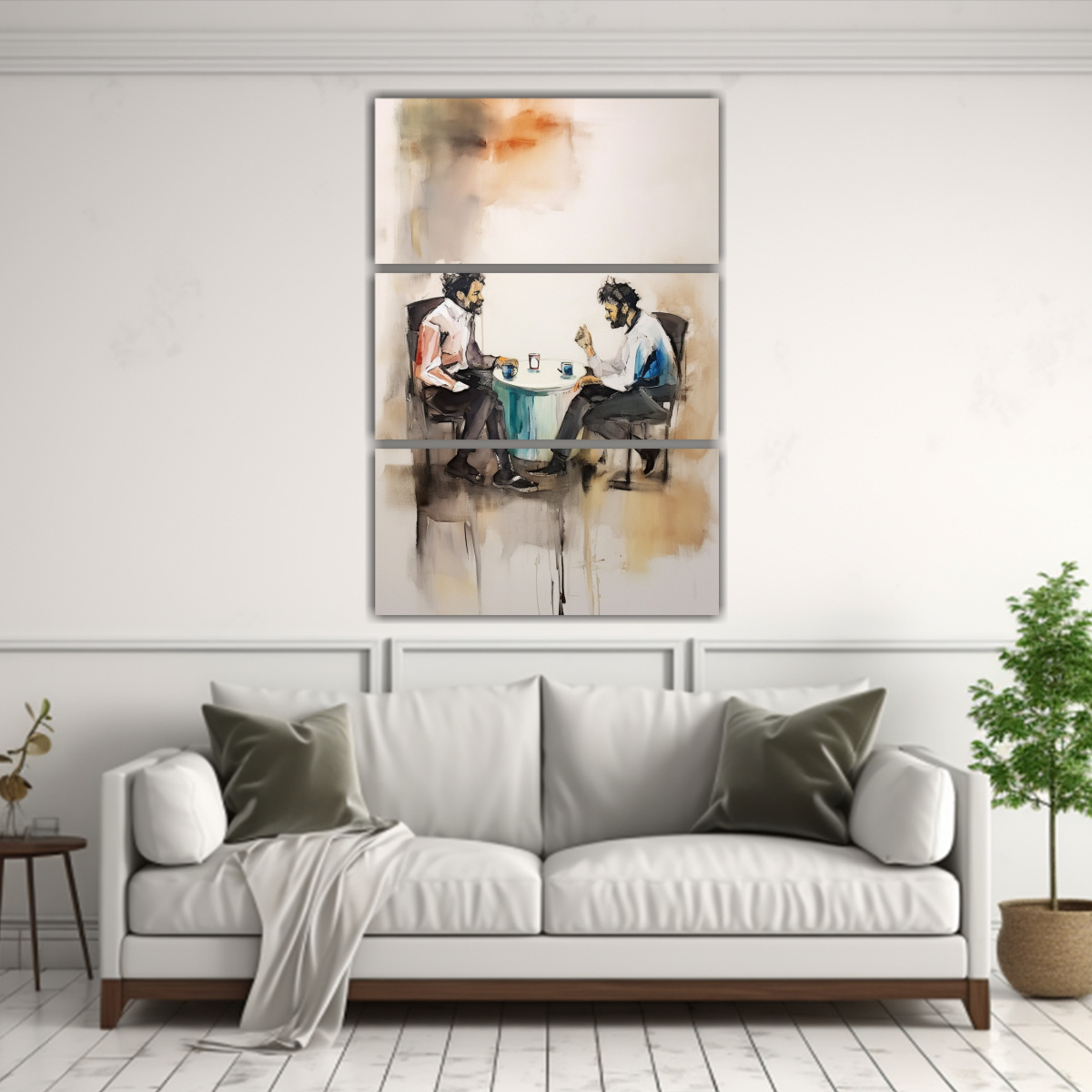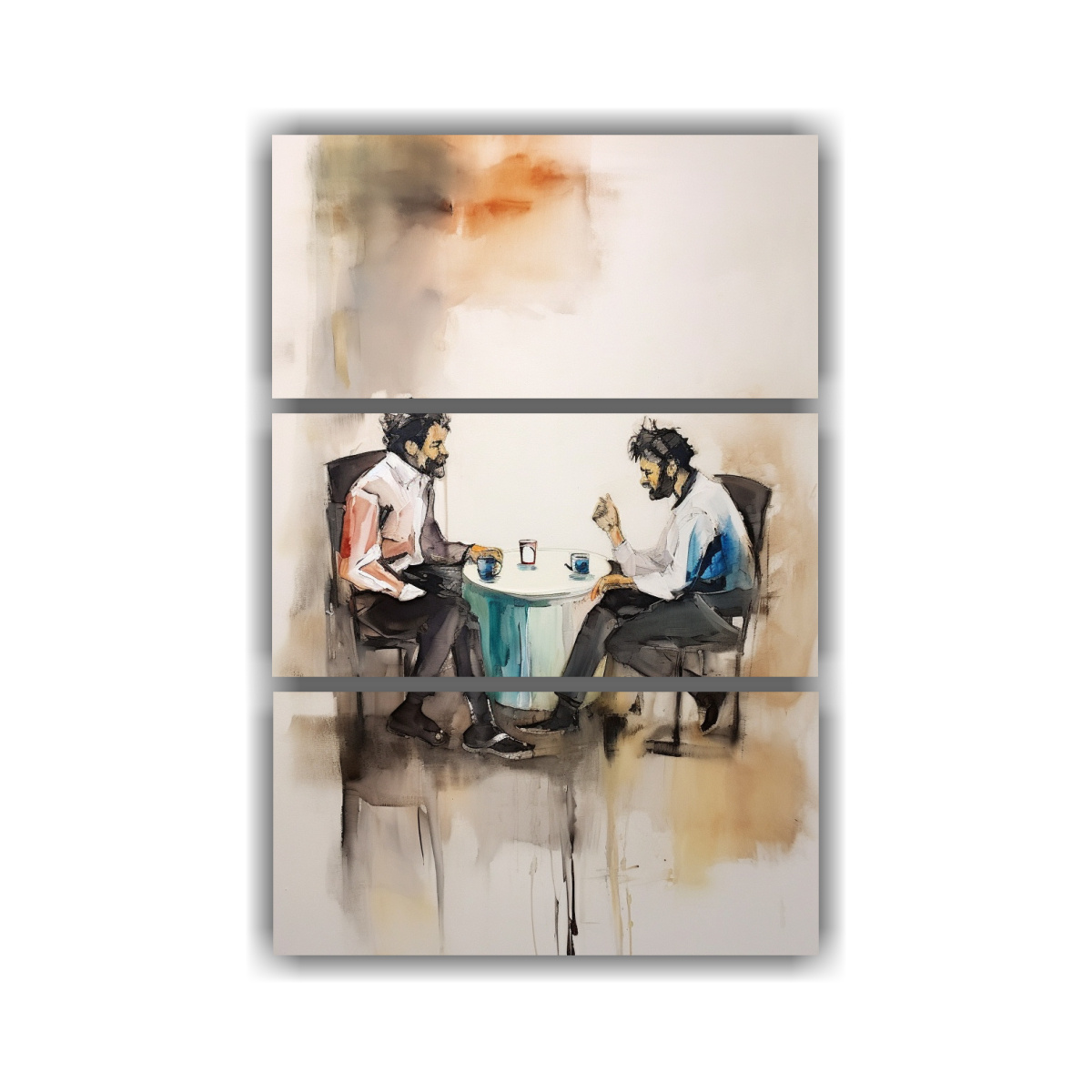 DecoCuadros presenta un cuadro decorativo con detalles intrincados de tres amigos sentados juntos y compartiendo grandes historias Este cuadro, con colores plateado, azul marino grisaceo, gris, beige y turquesa, es perfecto para agregar un toque moderno y elegante a cualquier espacio de tu hogar Nuestros cuadros están impresos en tela de alta calidad con bastidores de madera, lo que garantiza la mejor calidad del mercado Además, ofrecemos los precios más económicos, diseños exclusivos, entregas rápidas y envíos gratis en Santiago y envíos express a regiones