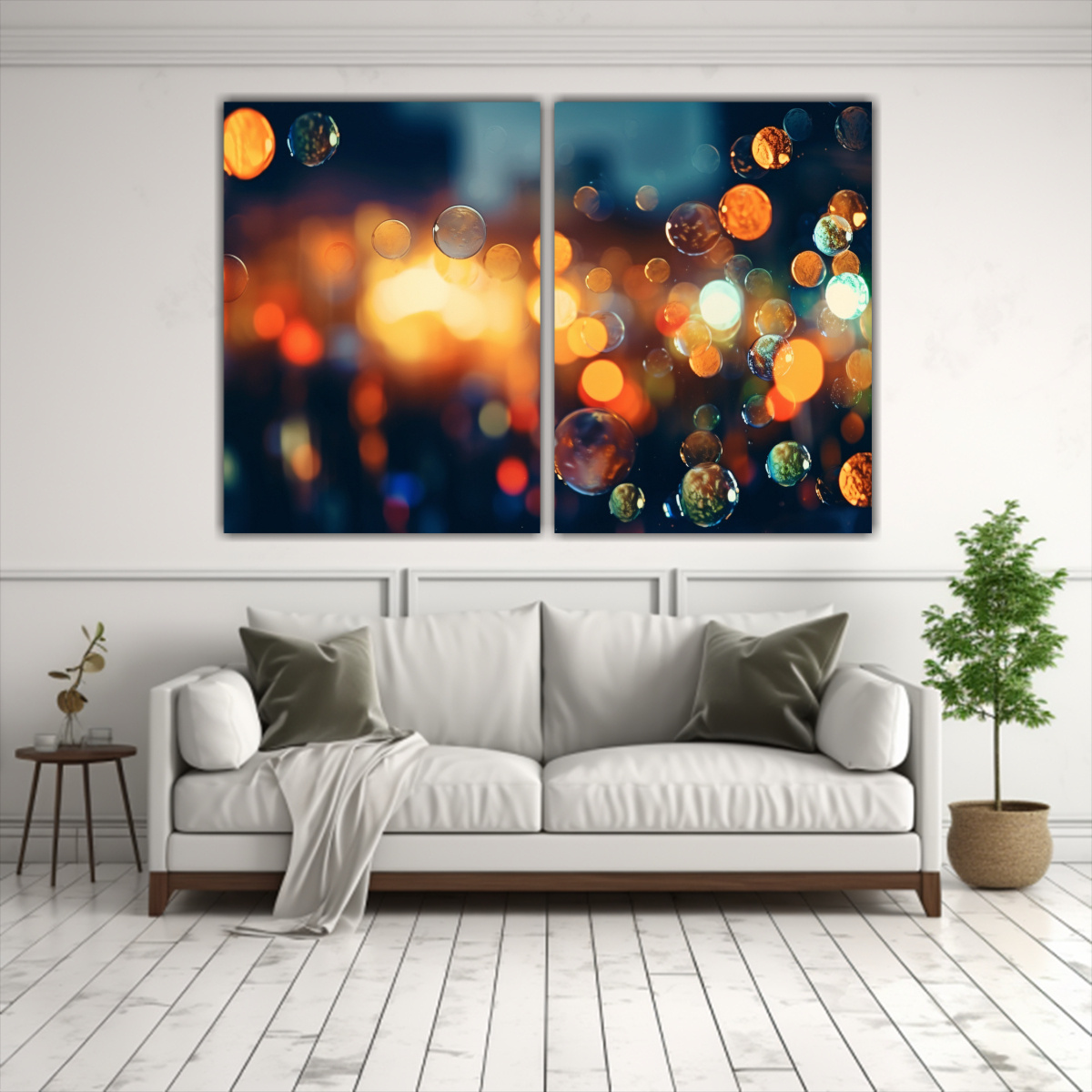 Para destacar este cuadro bokeh en Fine Arts Moderno, te recomendamos colocarlo en el centro de tu sala de estar, rodeado de muebles en tonos neutros como beige y gris Complementa la decoración con cojines en tonos coral y verde azulado para un ambiente armonioso y moderno