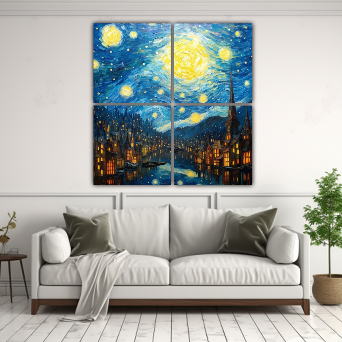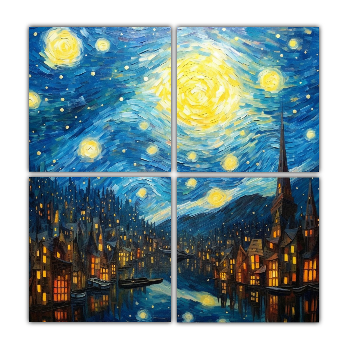 4 Telas en Bastidor Moderno Artesanal Its daytime starry night the style of Van Gogh Colores: plateado, azul marino grisáceo, verde azulado, turquesa, dorado, chocolate, gris, carmesí DecoCuadros tiene las entregas más rápidas y gratuitas en Santiago y envíos express a regiones