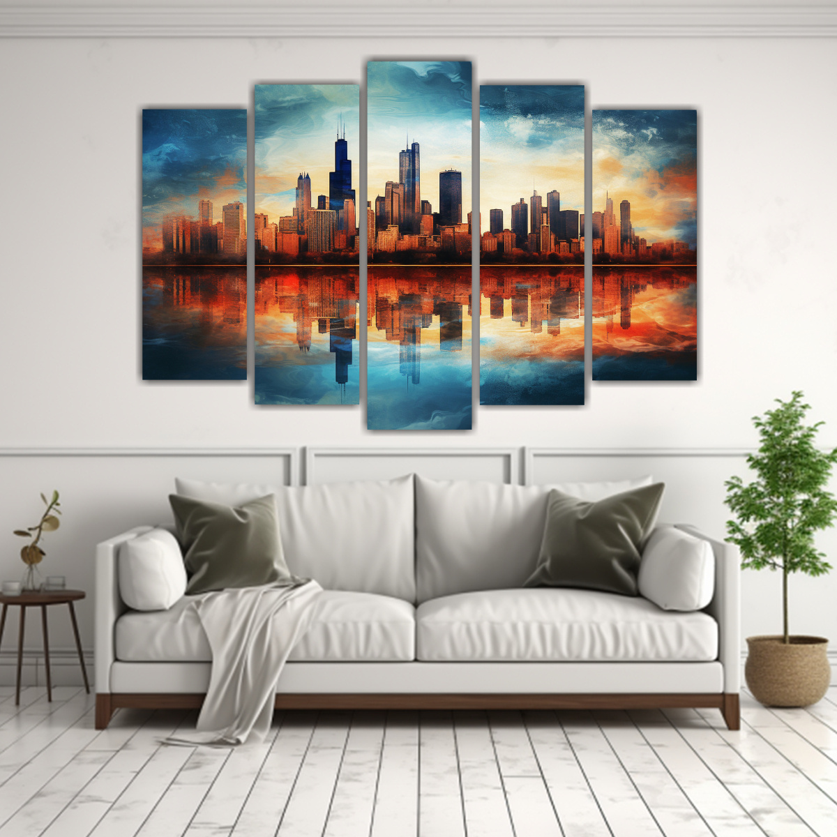 Coloca el cuadro del skyline de Chicago en tu sala de estar para crear un ambiente moderno y sofisticado Combínalo con muebles de colores neutros y detalles en tonos plateados y turquesas para resaltar su belleza y darle un toque urbano a tu espacio