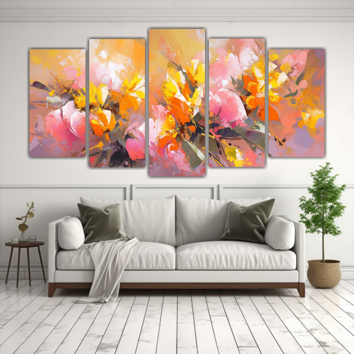 Pinturas Decorativas Con Flores Amarillas Y Magenta En Lienzo.