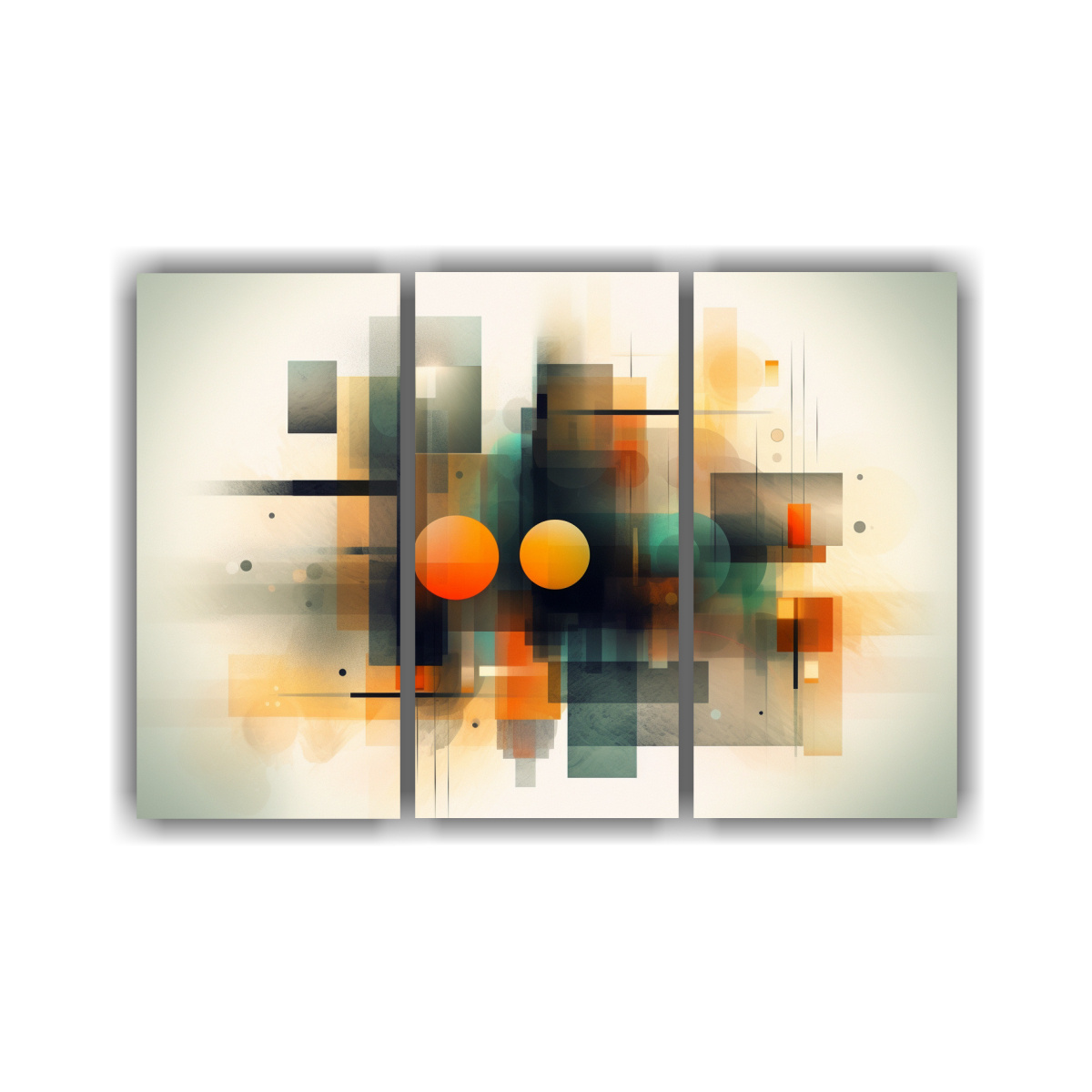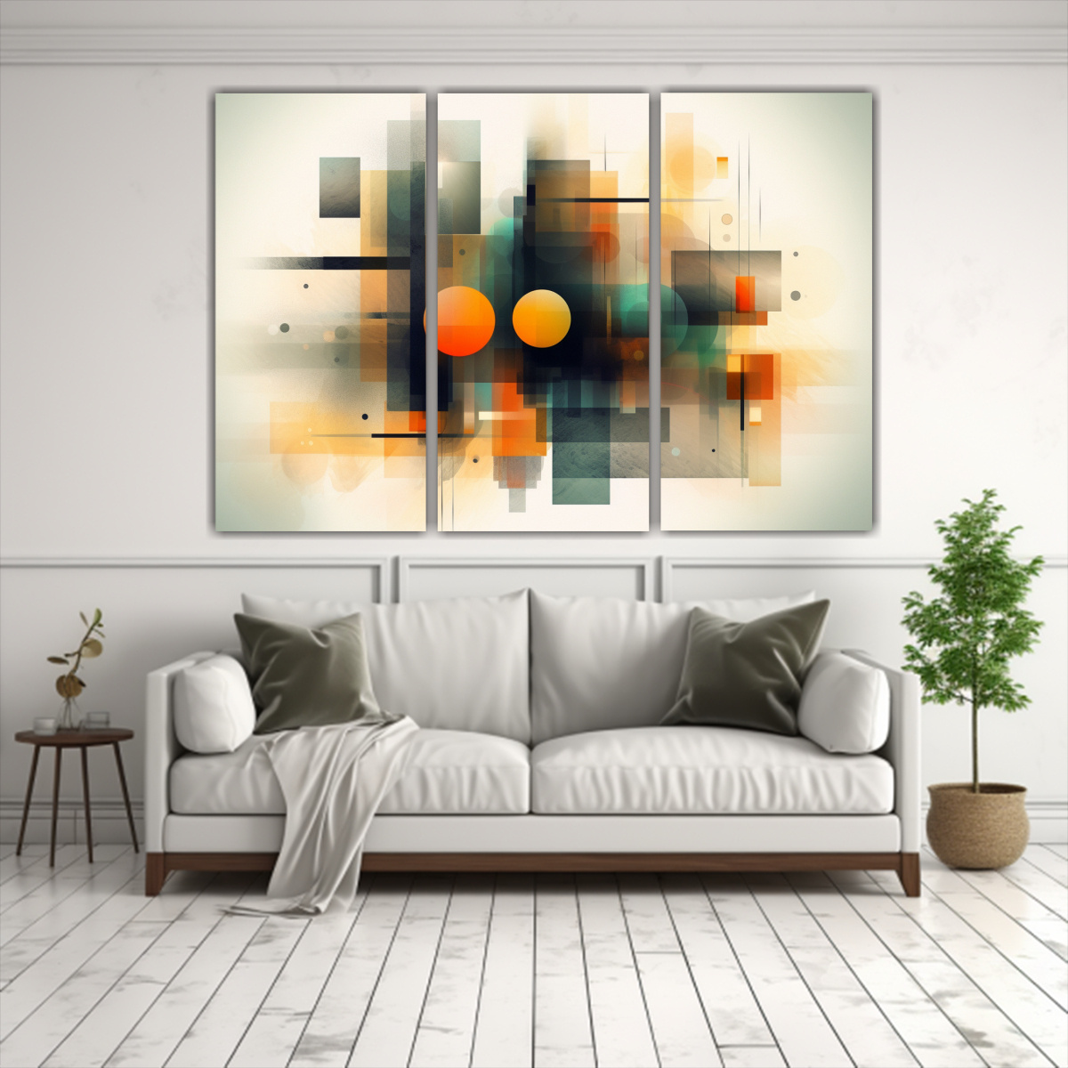Coloca este set de 3 composiciones en tu sala de estar para crear un ambiente moderno y sofisticado Combina los colores con muebles en tonos neutros para resaltar la calidez y elegancia de las pinturas, creando un espacio acogedor y vanguardista