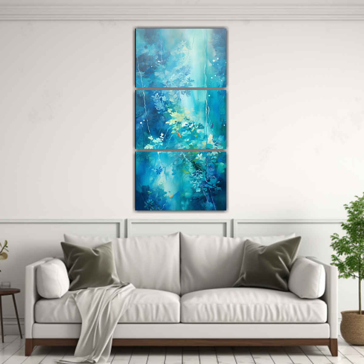 Para realzar la decoración de tu sala de estar, coloca este cuadro submarino refinado en el centro de la pared principal Combínalo con muebles en tonos neutros y detalles en verde esmeralda para crear un ambiente fresco y relajante