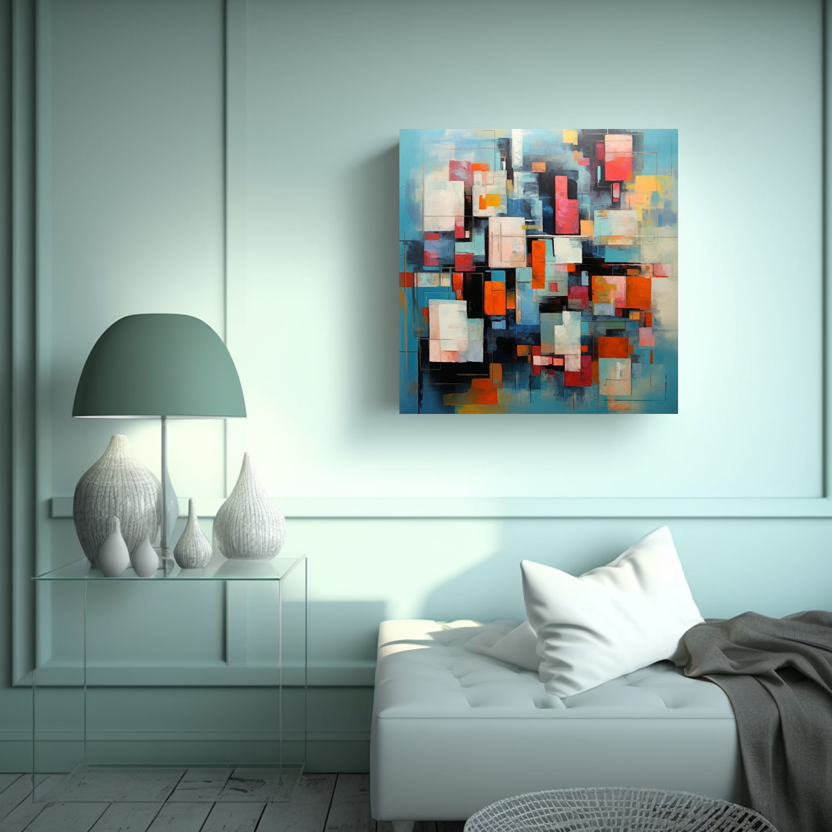 Este cuadro con textura estilo galería en los colores plateado, azul marino grisaceo, chocolate, gris, carmesí, coral y menta sería perfecto para decorar un salón o sala de estar Puede ser colocado como pieza central en una pared blanca para crear un contraste elegante y sofisticado Combínalo con muebles en tonos neutros y accesorios en colores similares para lograr una armonía visual ¡Transforma tus espacios con este cuadro exclusivo y lleno de estilo!