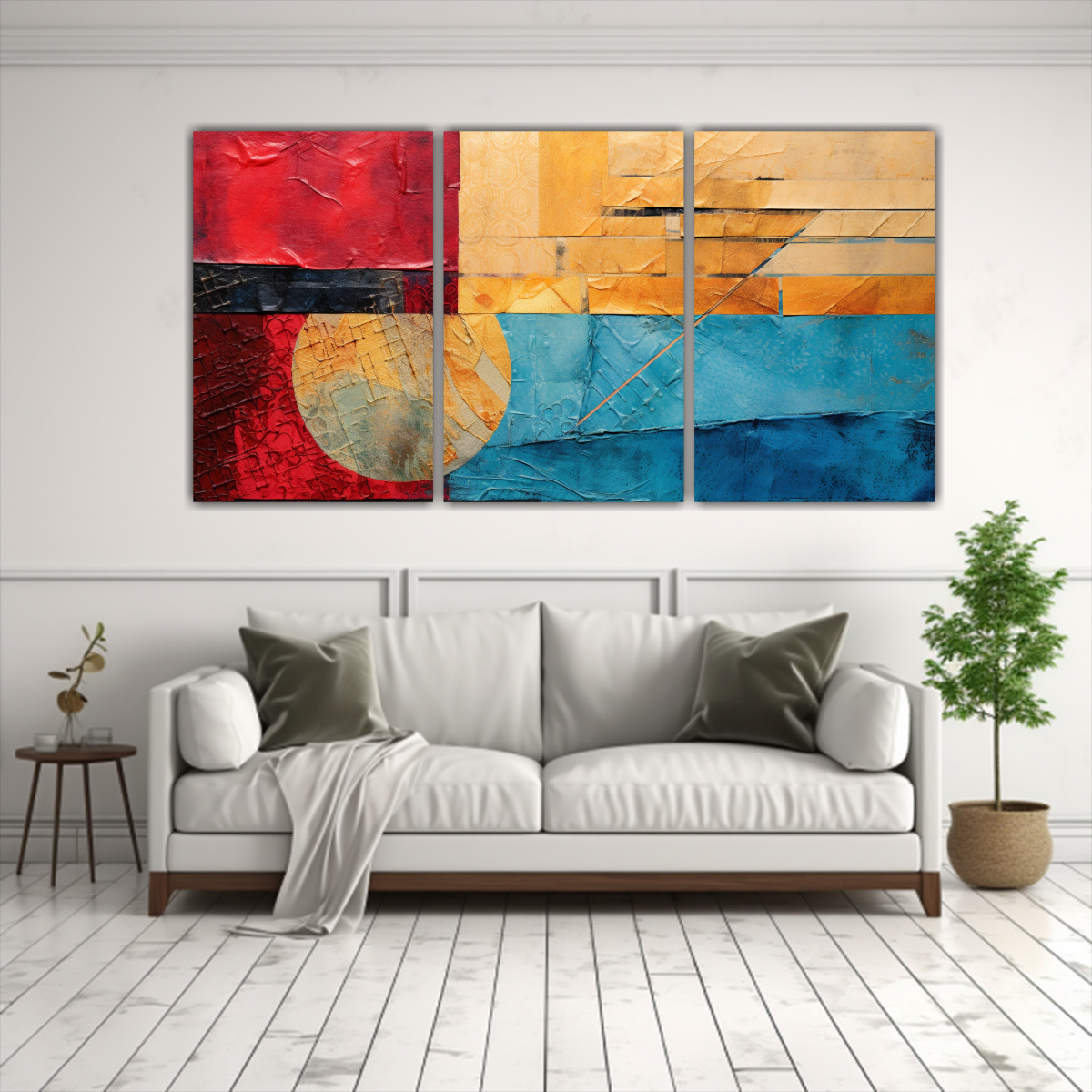 Decora tu hogar con nuestro set de 3 composiciones cuadro artesanal abstracto que combina texturas y colores carmesí, coral, verde azulado, gris, turquesa, negro y mostaza Diseños exclusivos de alta calidad con bastidores de madera ¡Compra ahora!