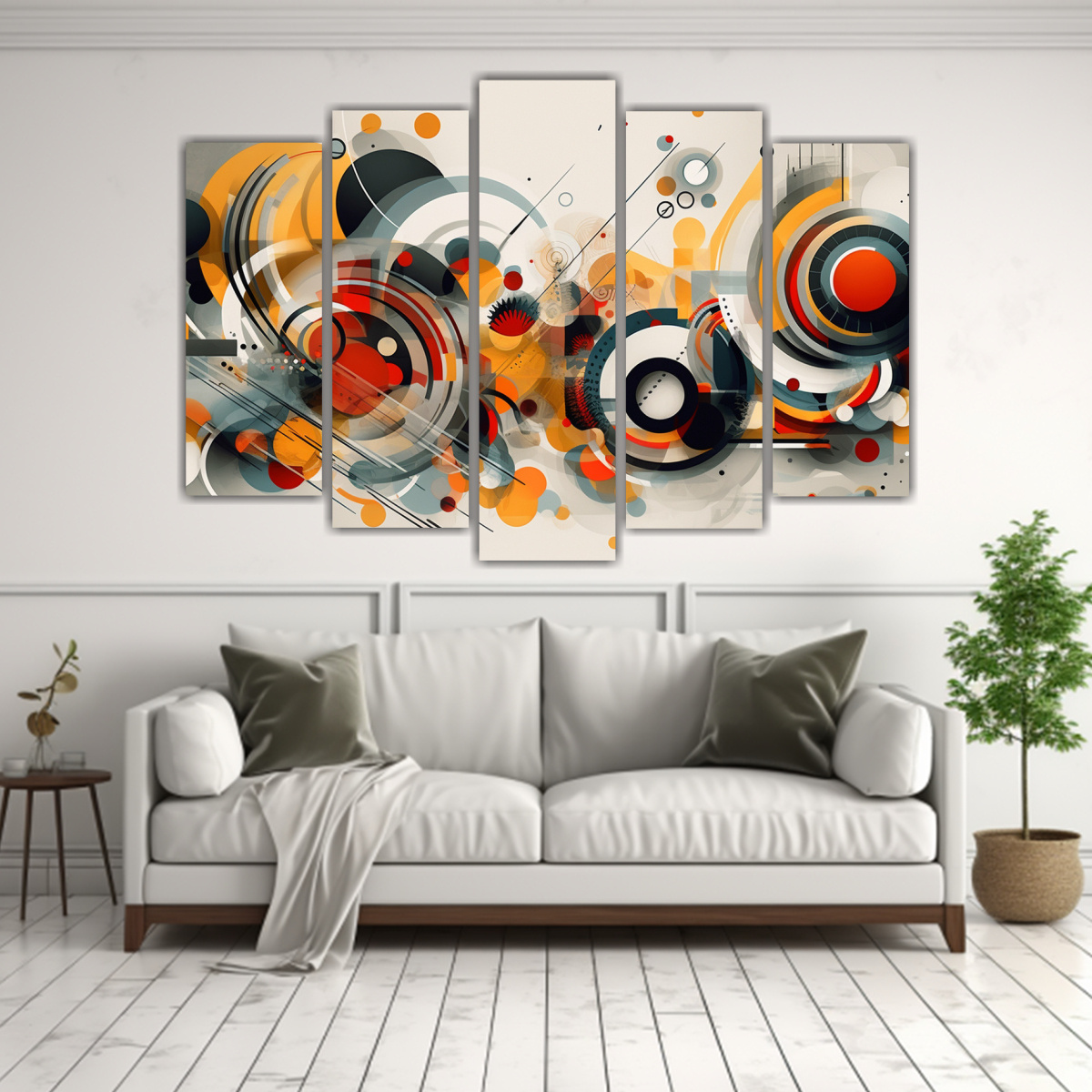 Este políptico conceptual para sala con diseños contemporáneos en tonos azul marino grisáceo, plateado, carmesí, coral, gris y beige, es ideal para colocar sobre un sofá de color neutro o una pared clara, creando un impacto visual elegante y moderno Complementa con cojines en tonos similares para una decoración armoniosa