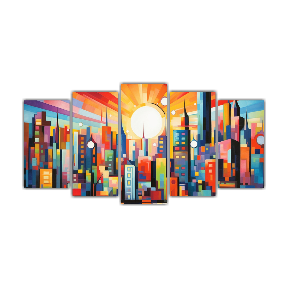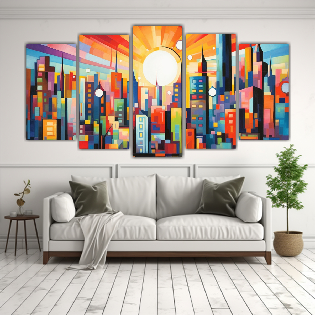 Este cuadro de paisajes urbanos contemporáneos es perfecto para decorar tu sala de estar o estudio Colócalo sobre un sofá de color neutro para resaltar los tonos vibrantes del cuadro y añade cojines en colores complementarios como el gris y el turquesa para crear una armonía visual en tu espacio