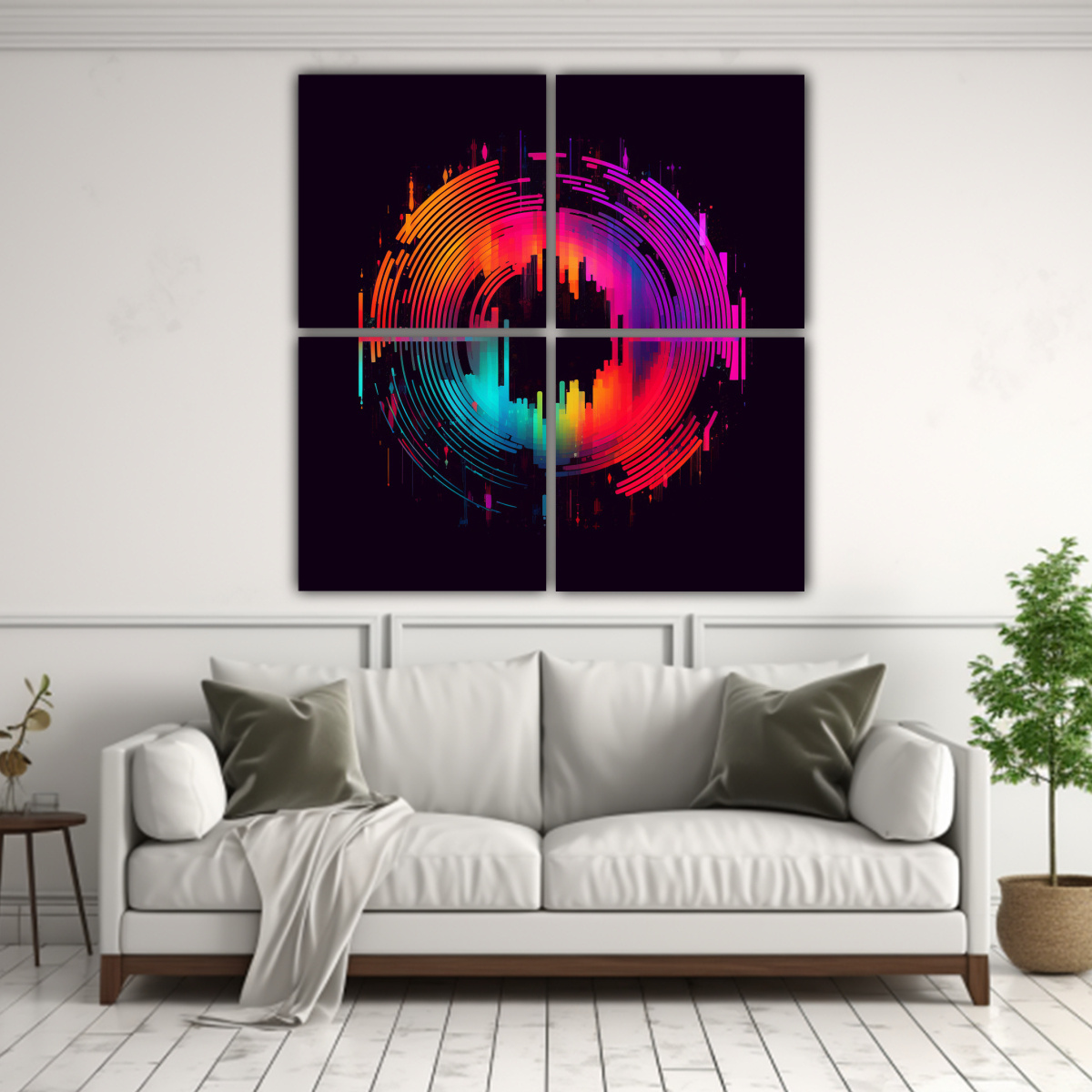 Este cuadro Cuatro Artes Estilo Galeria Vitalidad glitch se verá espectacular en tu sala de estar Combínalo con muebles en tonos neutros como blanco o gris claro para resaltar sus colores vibrantes Además, puedes colgarlo sobre un sofá o una repisa para crear un punto focal en la habitación ¡Atrévete a darle vida a tus espacios con este cuadro de diseño exclusivo!