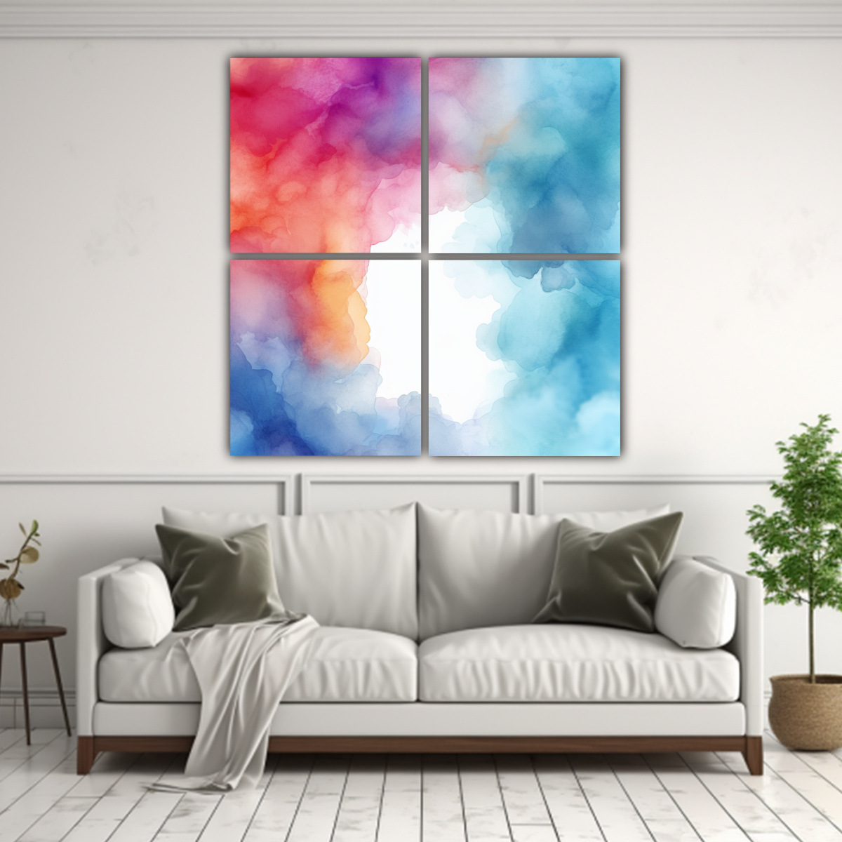 Este cuadro de acuarela floral abstracta en cuatro cuadros sería ideal para decorar una sala de estar moderna Colócalo sobre un sofá de color neutro para resaltar los tonos plateado, carmesí, turquesa, gris, coral, lila y violeta Complementa con cojines o cortinas en tonos similares para crear un ambiente sofisticado y armonioso