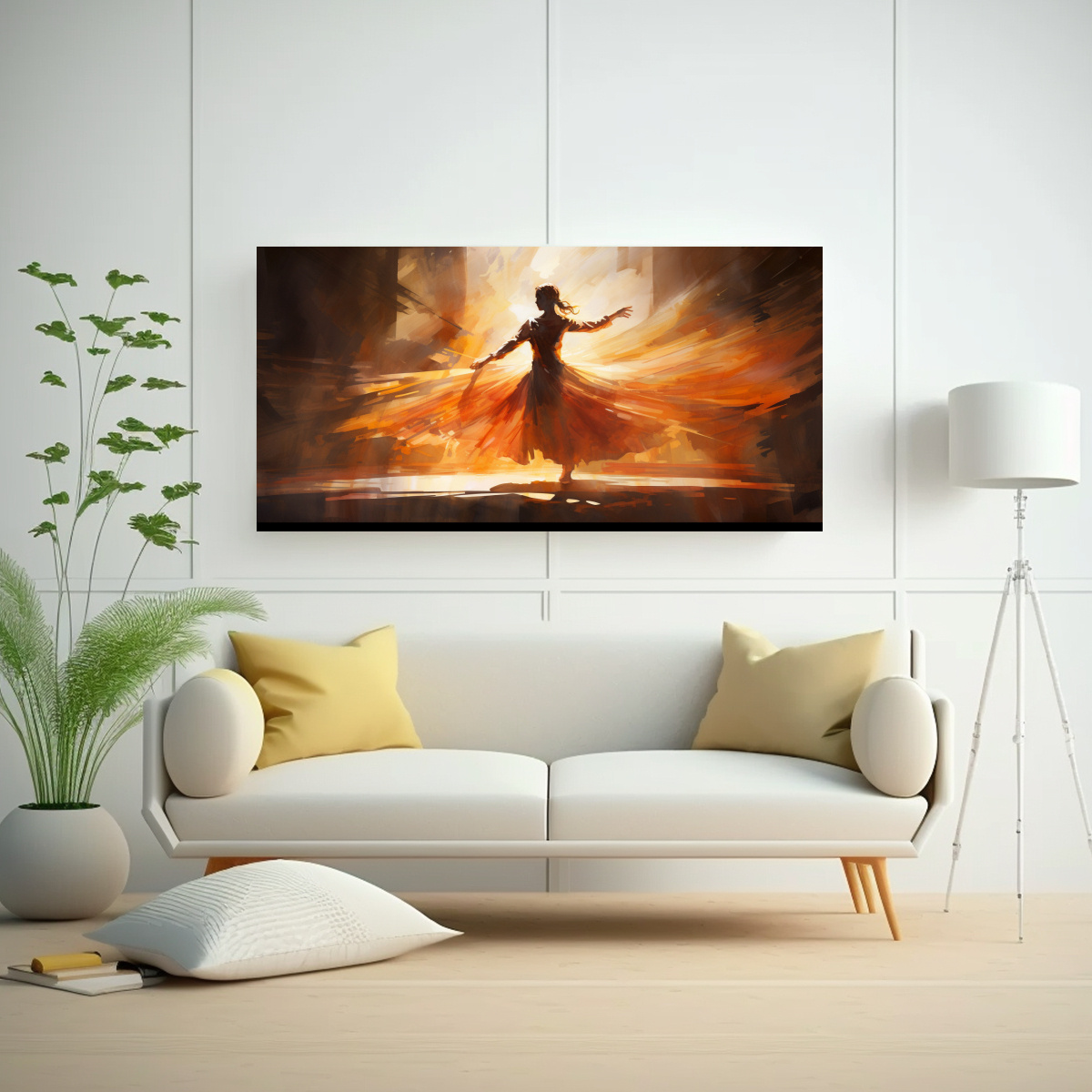 Este cuadro de arte abstracto danza de luz y sombra en colores Amarillo Claro, Chocolate, Coral, Negro, Carmesí, Azul Marino grisáceo, Lila y Dorado es ideal para decorar tu sala de estar o tu dormitorio Combínalo con muebles en tonos neutros como blanco, gris o beige para crear un ambiente sofisticado y elegante