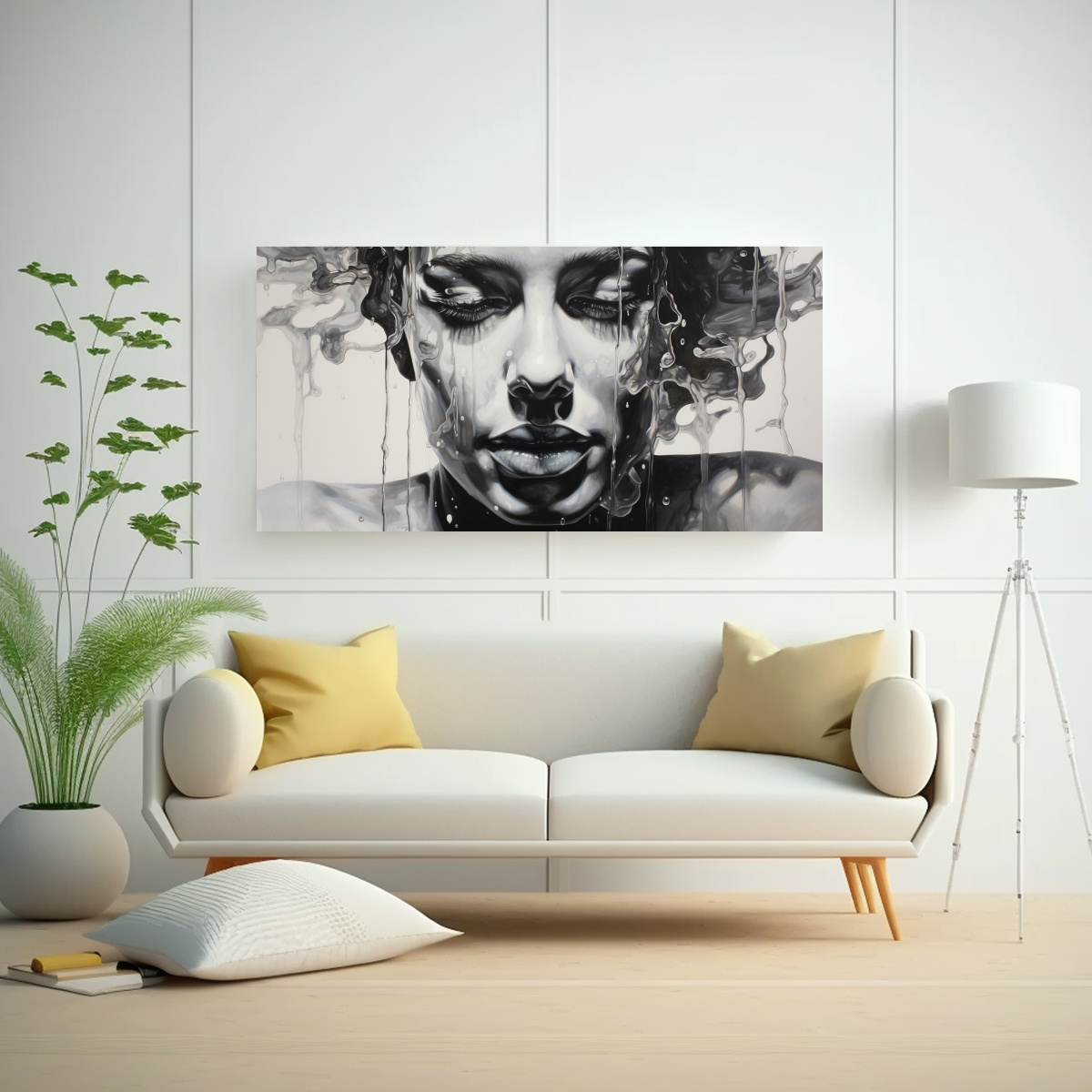Este cuadro es perfecto para decorar una sala de estar moderna Colócalo sobre un sofá de tonos neutros para resaltar la elegancia de los contornos faciales y las salpicaduras en plata y negro Combínalo con cojines y accesorios en tonos azul marino grisáceo, plateado, dorado y gris para crear una armonía en la decoración del espacio ¡Sorprende a tus invitados con este diseño exclusivo y dale un toque sofisticado a tu hogar!