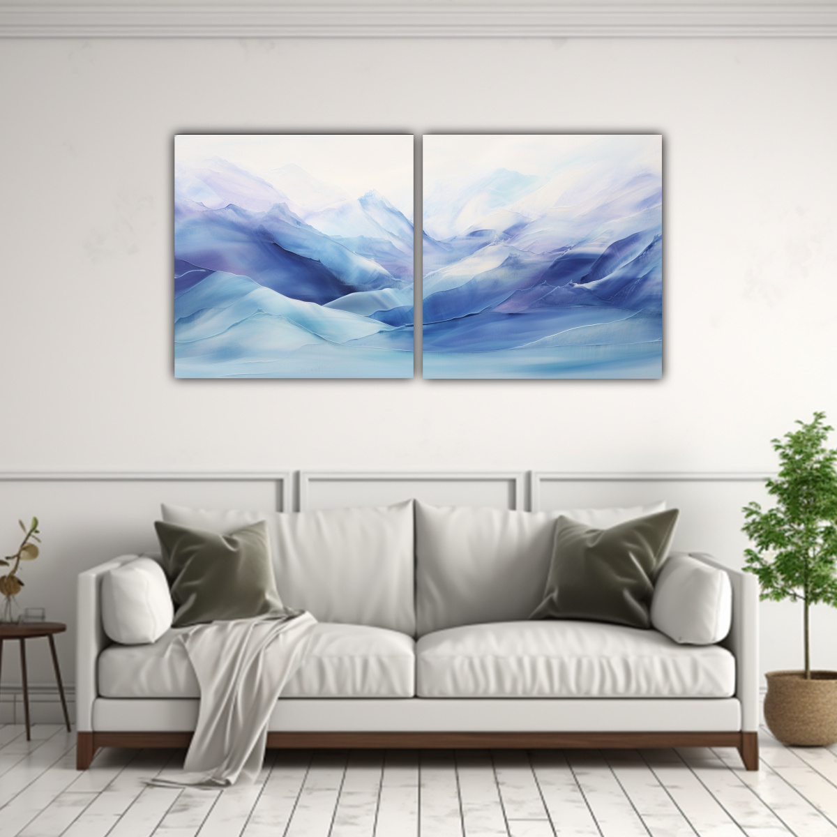 DecoCuadros ofrece dipticos de alta calidad con una interpretación abstracta de un paisaje de montaña en colores beige, gris, turquesa y plateado Los cuadros están impresos en tela de alta calidad con bastidores de madera y tienen diseños exclusivos