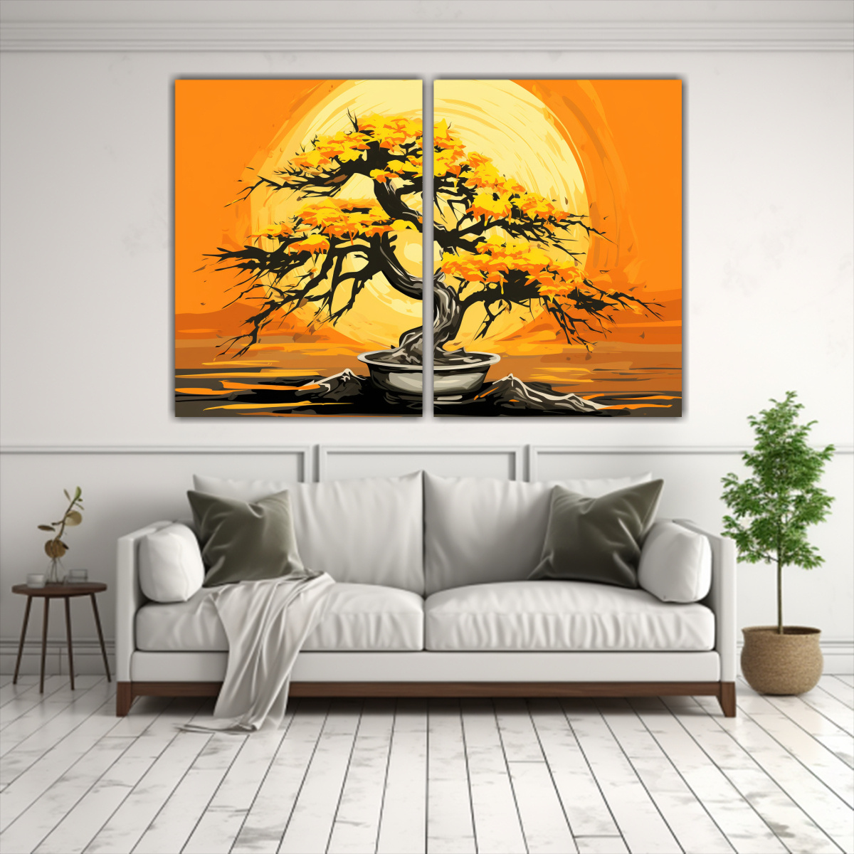 Este cuadro de bonsái en amarillo y naranja se vería espectacular en tu sala de estar sobre un mueble de madera clara para resaltar los tonos cálidos Combínalo con cojines en gris y coral para un ambiente acogedor y moderno