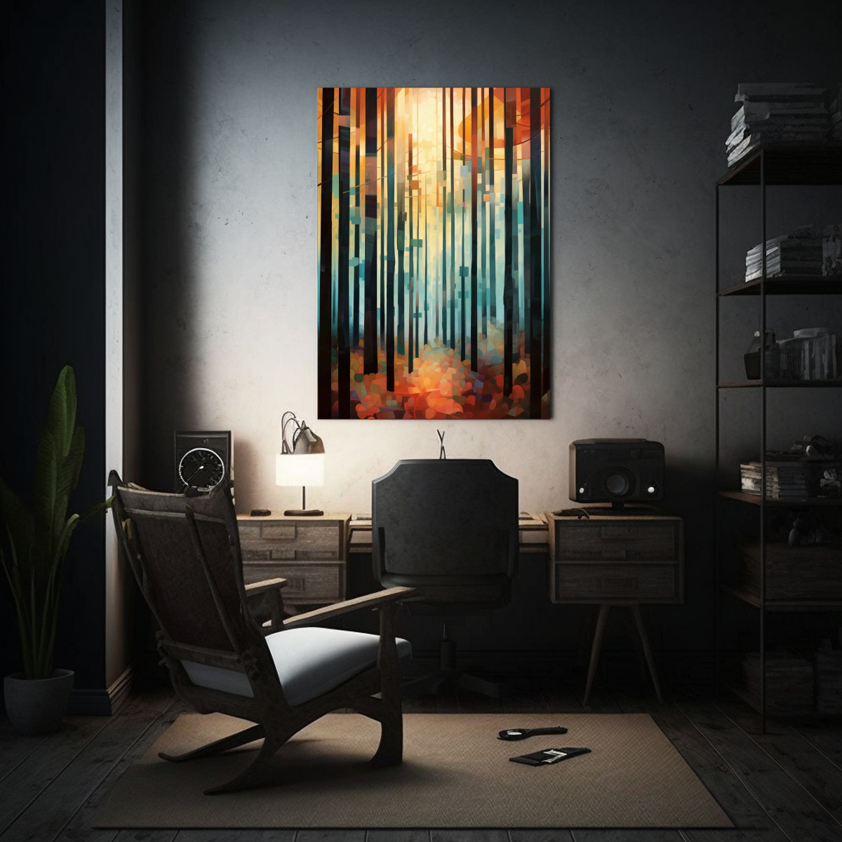 Este cuadro de bosque modernista colorido y futurista sería perfecto para decorar tu sala de estar Puedes colocarlo sobre un sofá de color neutro para crear un contraste llamativo Además, puedes combinarlo con cojines en tonos plateados, amarillos claros y azules para resaltar aún más los colores del cuadro ¡Agrega un toque de modernidad y color a tu hogar con este cuadro de DecoCuadros!