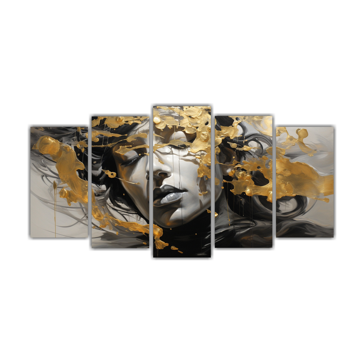 Pinturas Decorativas De Cinco Composiciones Expresión Alegre Con Contornos Faciales Y Salpicaduras De Plata Y Oro