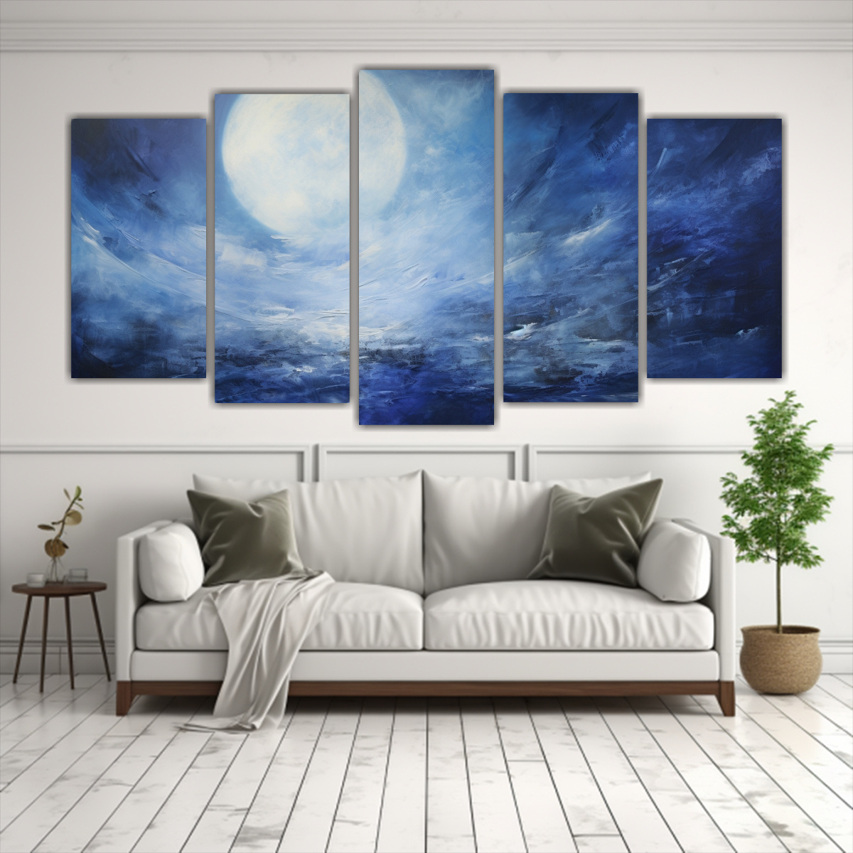 Decora tu hogar con las pinturas decorativas de Cinco Composiciones Movimiento Estético Estas obras de arte abstractas interpretan la serenidad de la luna con colores como el plateado, azul marino grisáceo, gris y turquesa Nuestros cuadros están impresos en tela de alta calidad con bastidores de madera, lo que garantiza la mejor calidad del mercado Aprovecha nuestros precios económicos y diseños exclusivos Realizamos entregas rápidas y gratis en Santiago, y envíos a regiones express