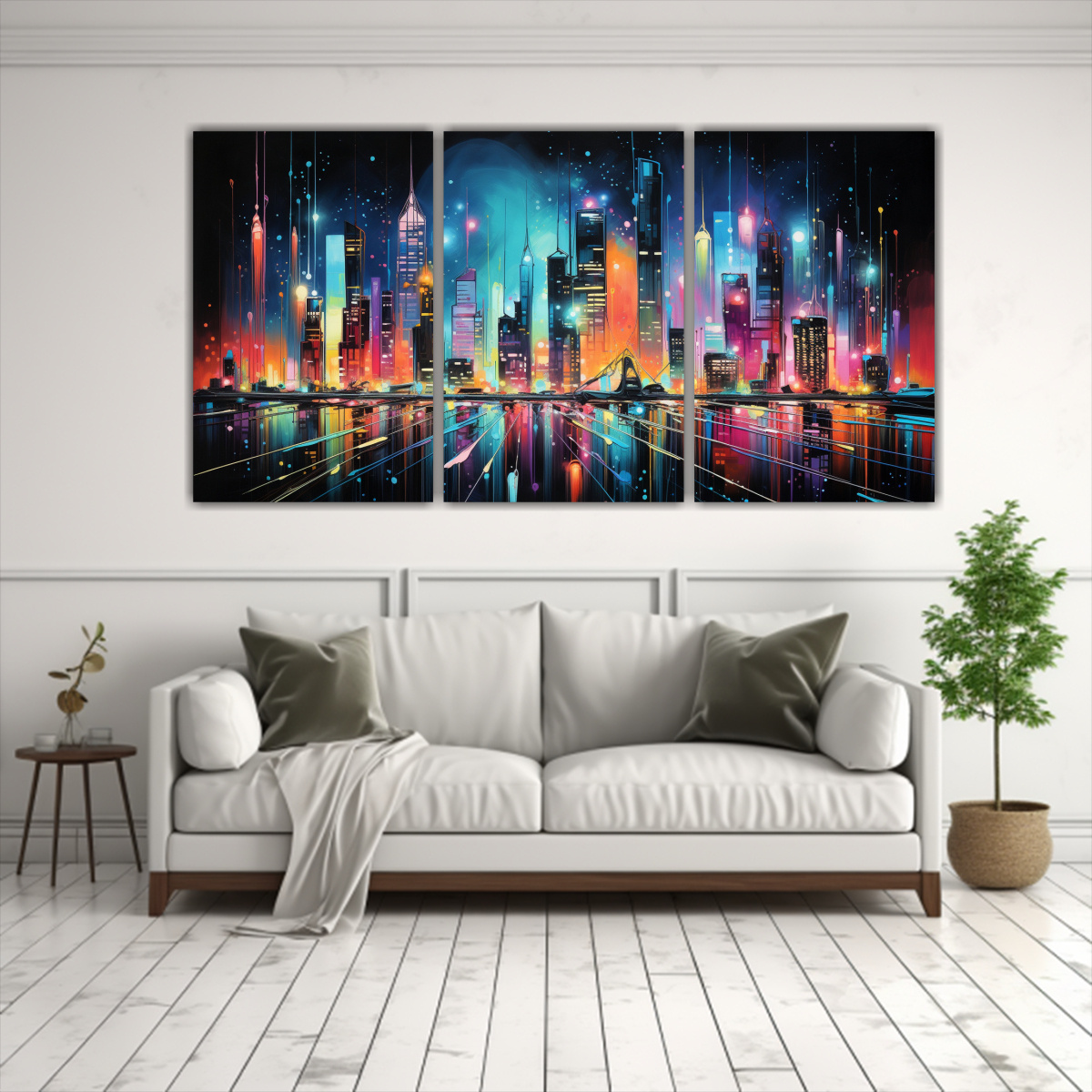 DecoCuadros te ofrece el cuadro ‘Pinturas decorativas de ciudad abstracta en luces de neón Tres Artes’ con diseños exclusivos, impresos en tela de alta calidad y con bastidores de madera Envío gratis en Santiago y envíos express a regiones