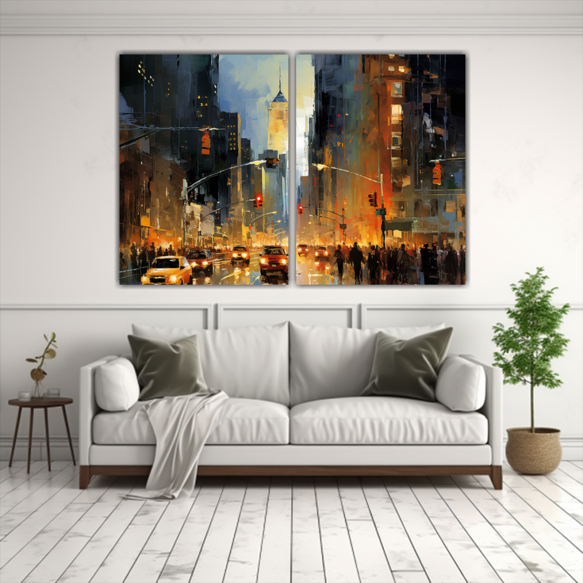 Pinturas Decorativas De Ciudad Con Rascacielos: Set De 2 Lienzos Ilustrados