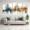 Este cuadro de composición arquitectónica reinterpretada en tonos Azul Marino grisaceo, Beige, Chocolate, Gris, Coral, Plateado, Turquesa y Lila, sería perfecto para decorar tu sala de estar Colócalo sobre un sofá de color neutro para crear un contraste elegante y moderno en tu espacio