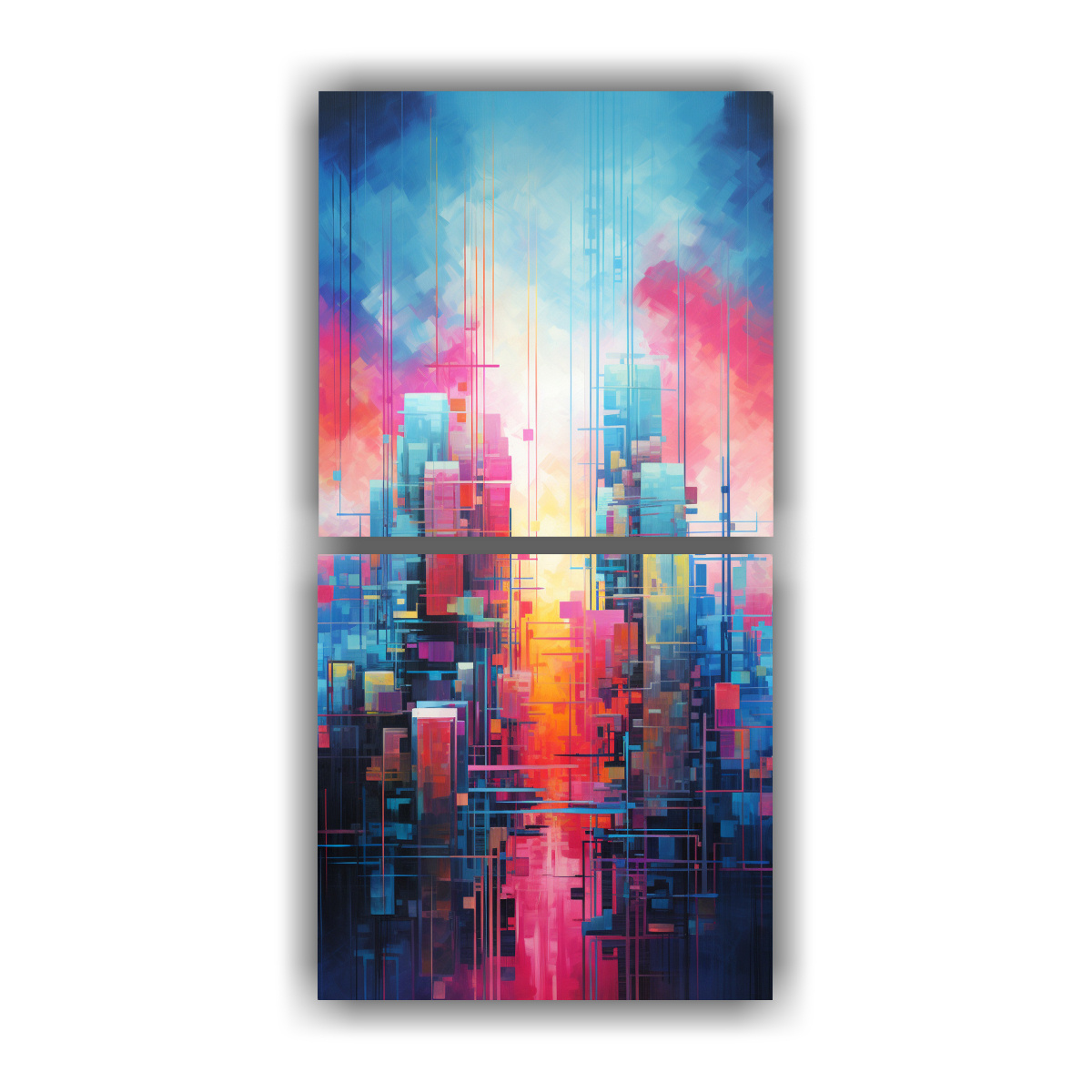 Pinturas Decorativas De Composición Elegante En Lienzo Con Arte De Glitch Mezclado Y Vibrantes Paisajes Urbanos
