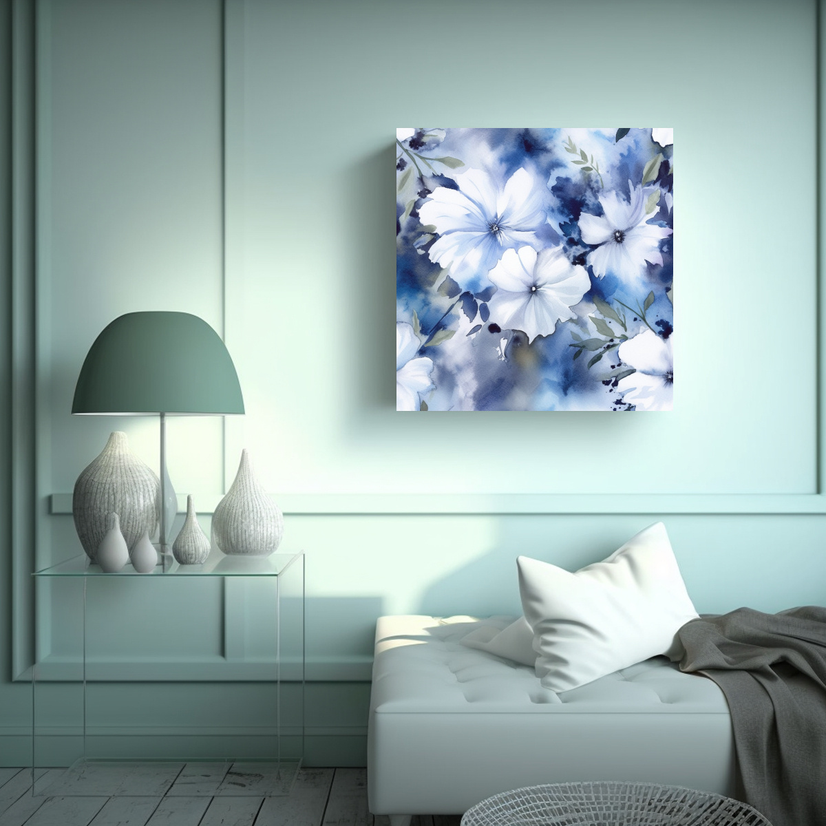 Este hermoso cuadro de flores azules y blancas de agua se verá perfecto en tu sala de estar Colócalo sobre una pared beige para resaltar los detalles intrincados y combínalo con muebles en tonos grises y plateados para crear un ambiente sofisticado y elegante