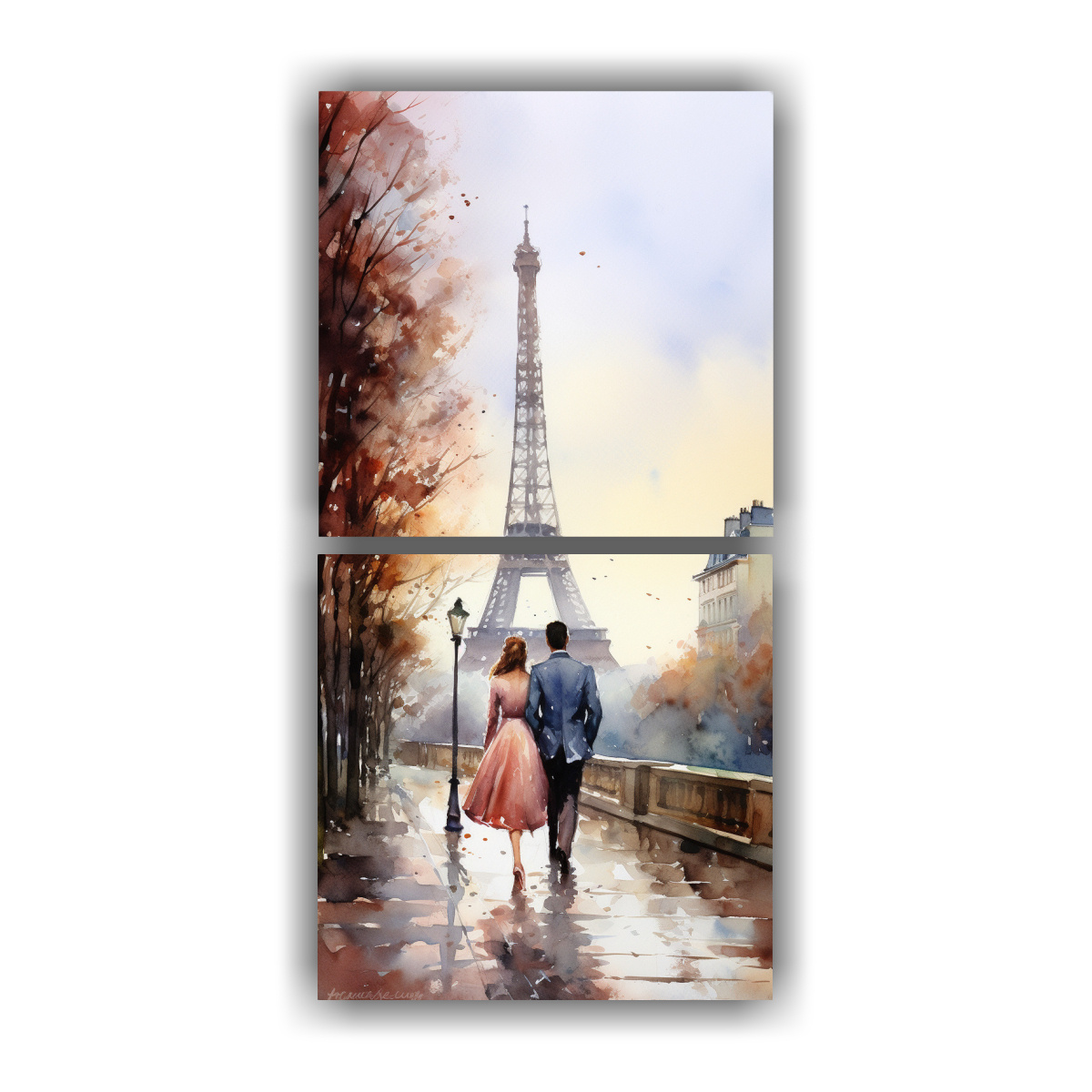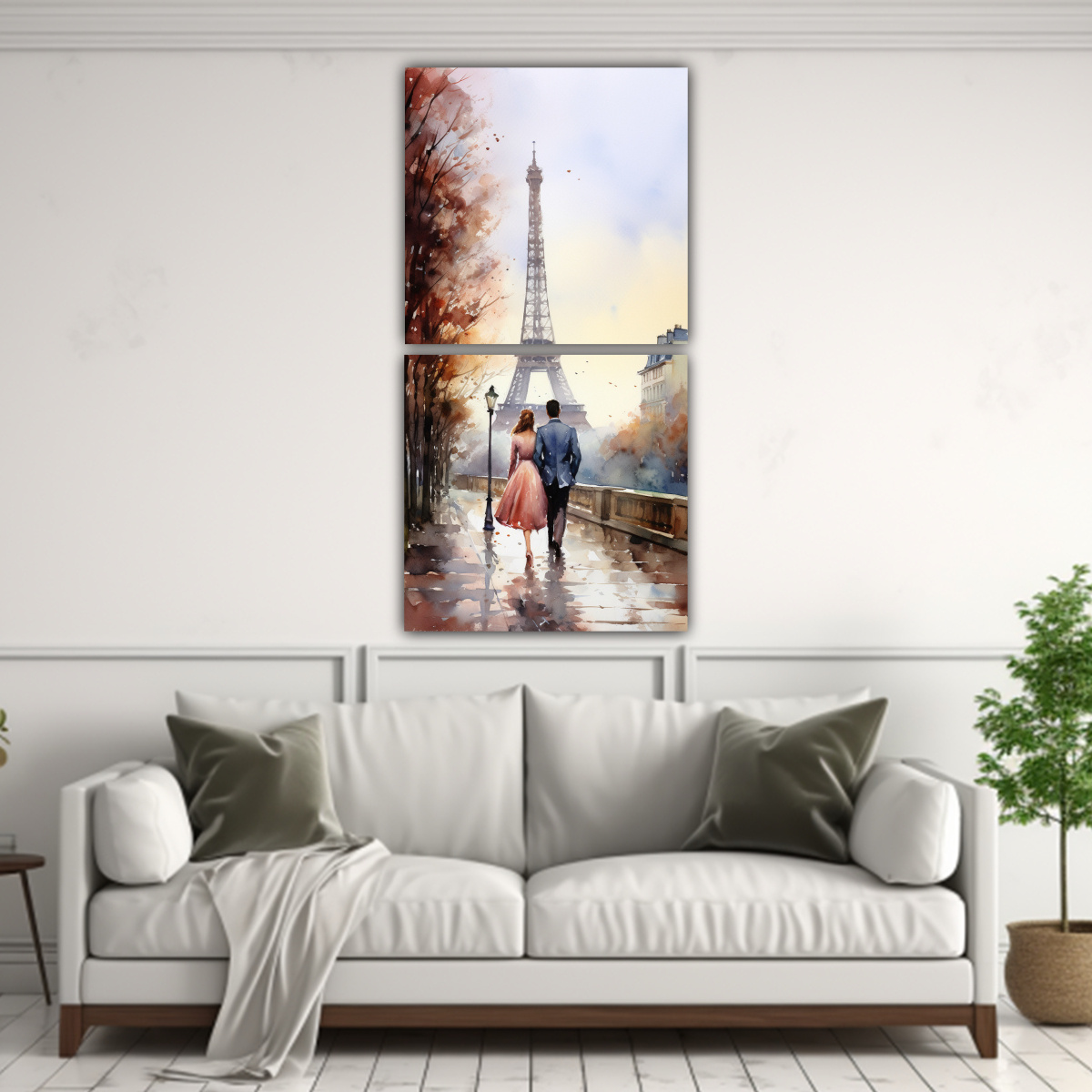 Pinturas Decorativas De Dos Cuadros Composición Luminosidad Joven Pareja Caminando Frente A La Torre Eiffel