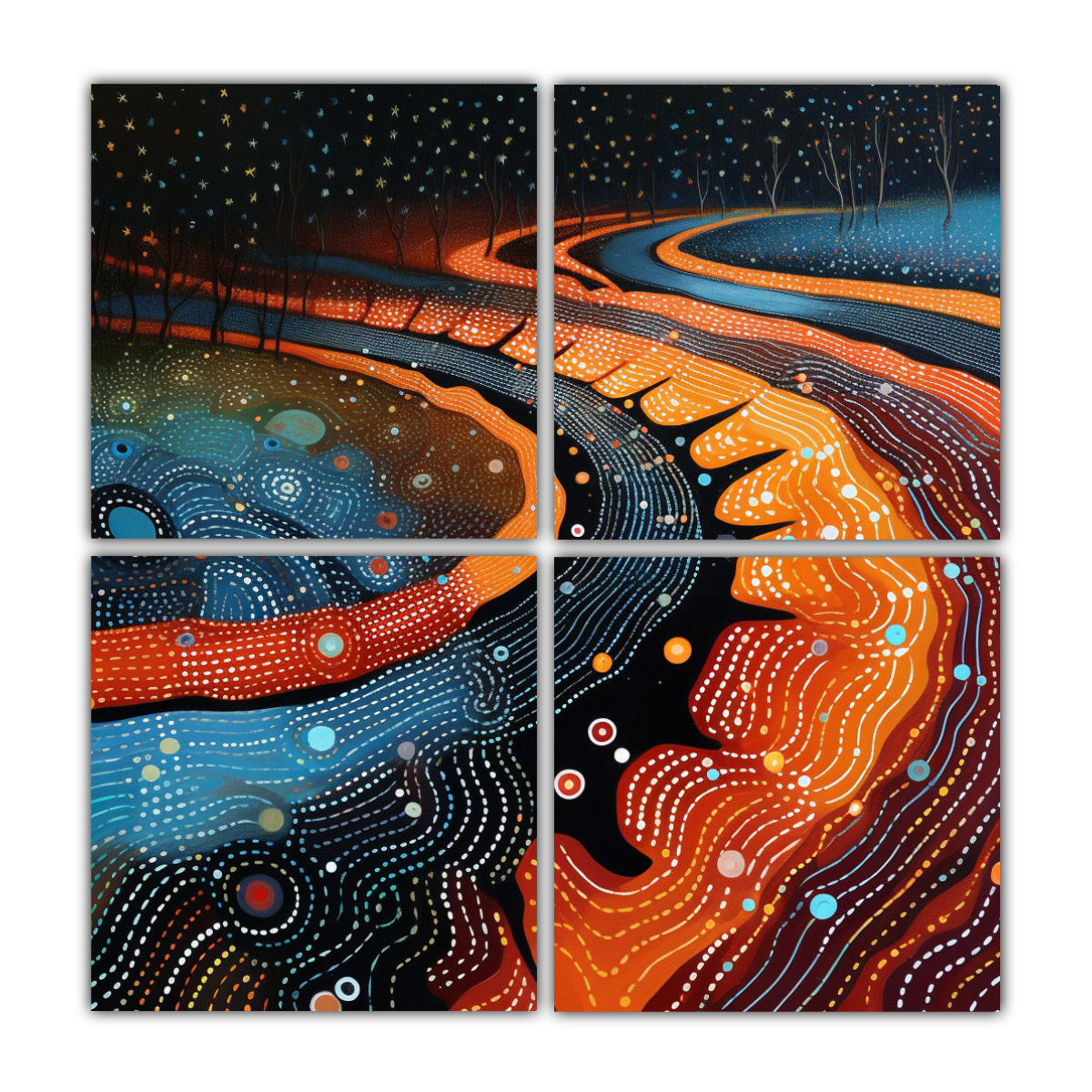 Decora tus espacios con nuestras composiciones de obra maestra de dot art retrofuturista aborigen indígena Impresas en tela de alta calidad y con bastidores de madera, nuestros cuadros son exclusivos y de entrega rápida