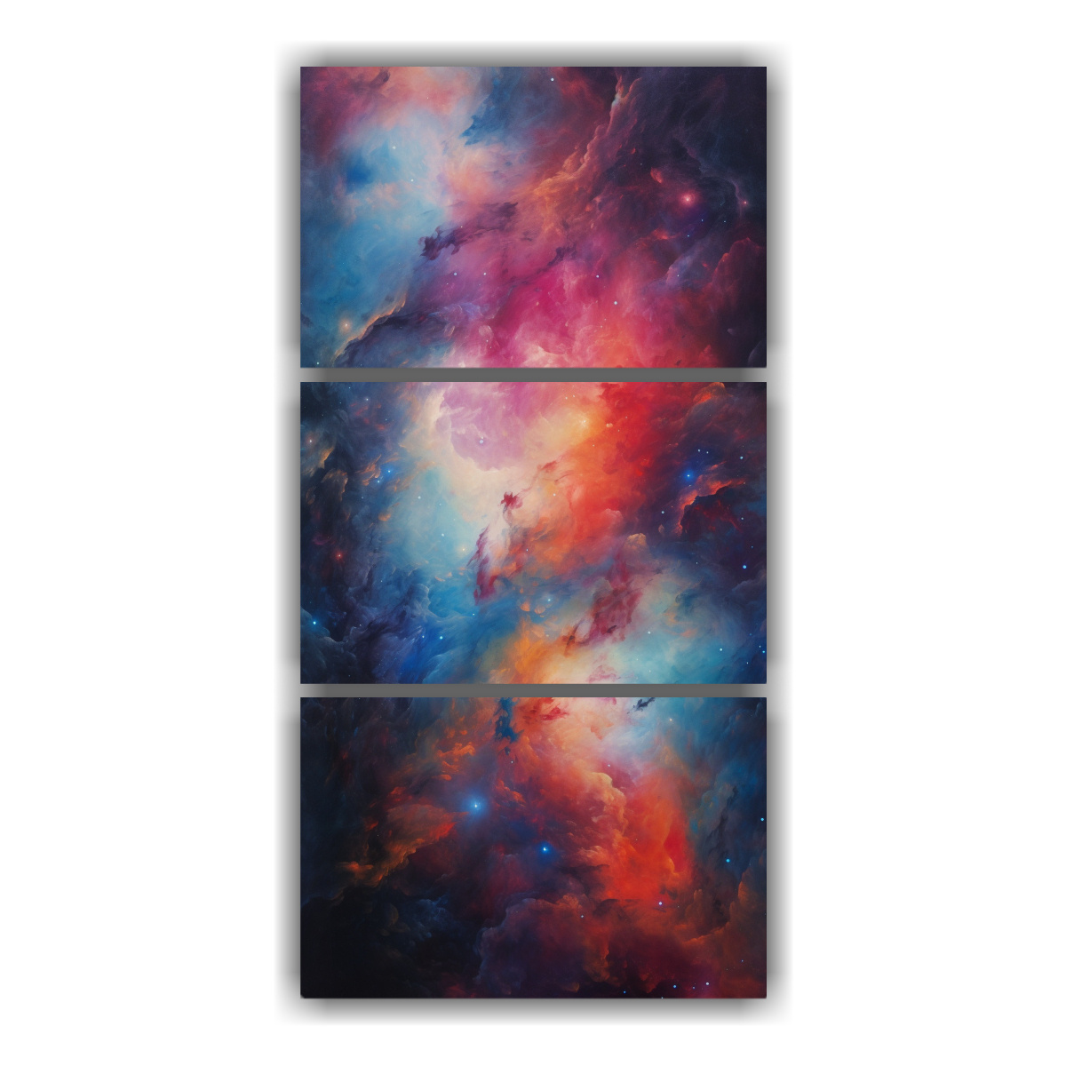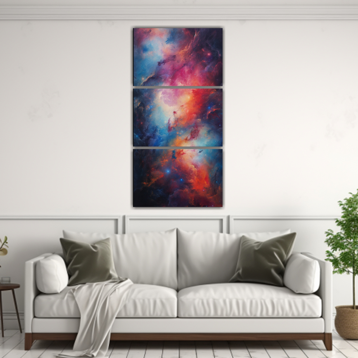 Una excelente manera de realzar la decoración de tu sala de estar es colocando este set de 3 lienzos sobre un mueble auxiliar blanco a media altura Acompáñalo con plantas verdes para crear un ambiente fresco y relajante ¡Deja que la abstracción cósmica de la nebulosa distante llene de energía positiva tu hogar!