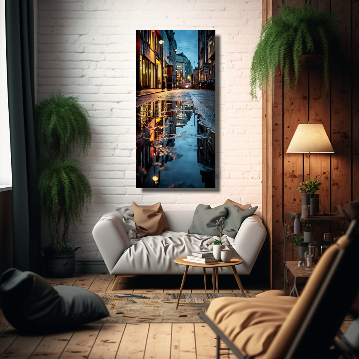 Decora tu sala de estar o tu espacio de trabajo con nuestra pintura decorativa de estilo urbano con reflexiones abstractas en calles mojadas Este cuadro combina perfectamente con muebles y accesorios en tonos neutros, como gris, blanco o negro, creando un ambiente moderno y elegante Colócalo sobre un sofá o una mesa de centro para destacar su belleza y llamar la atención de tus invitados ¡Agrega un toque de arte contemporáneo a tu hogar con DecoCuadros!