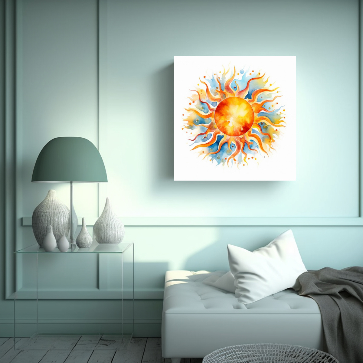 Coloca el cuadro de fantasía con sistema solar acuarela brillante en tu sala de estar para darle un toque de magia y creatividad Combínalo con muebles en tonos neutros como beige o gris, y agrega cojines en colores mint y dorado para resaltar los detalles del cuadro ¡Te encantará el resultado!