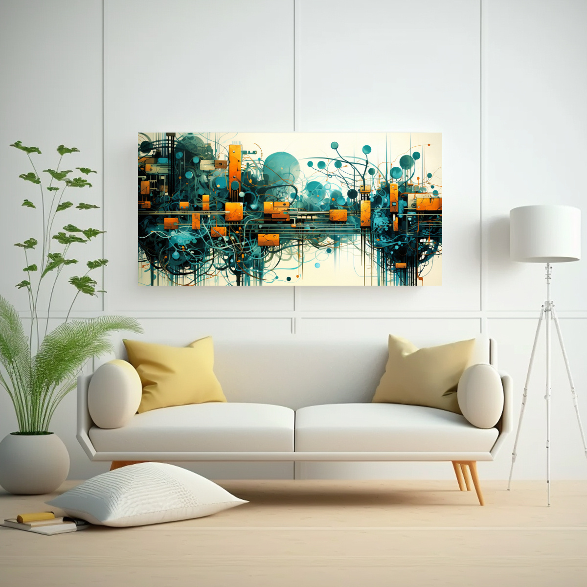 Este cuadro de fusión abstracta de tecnología y naturaleza es ideal para decorar una sala moderna Colócalo sobre un sofá de color neutro, como beige o gris, para resaltar sus tonos azules, turquesas y plateados Complementa con cojines en tonos dorados y menta para lograr una armonía perfecta Añade elementos de naturaleza, como plantas o flores, para resaltar la fusión entre lo tecnológico y lo natural ¡Crea un ambiente sofisticado y único con este cuadro exclusivo de DecoCuadros!